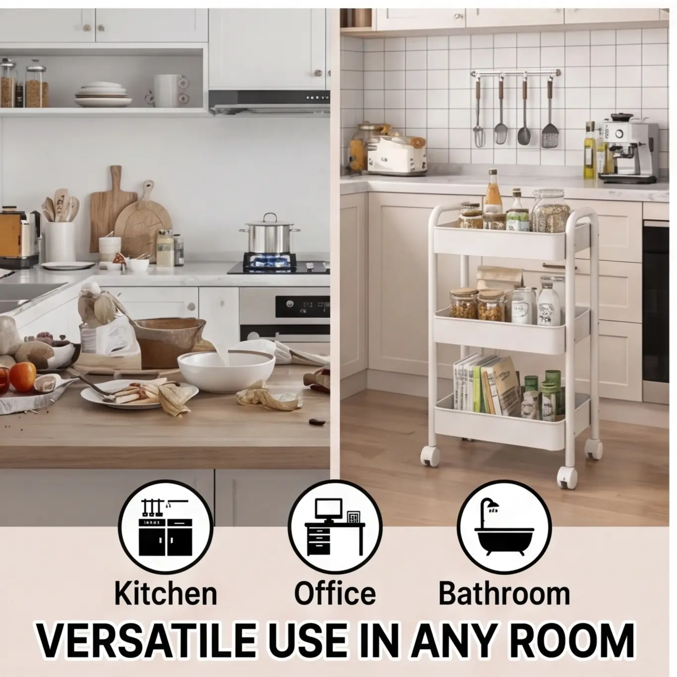 Versatile 3 Tier Rolling Storage Organizer This multi-functional rolling shelf is your all-in-one storage solution! Perfect for kitchen pantry organization, bathroom toiletries, office supplies, craft room storage, and salon equipment. Slim design fits in tight spaces, durable metal construction ensures long-lasting use. The must-have rolling storage organizer for every home!