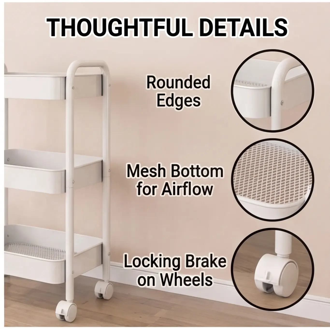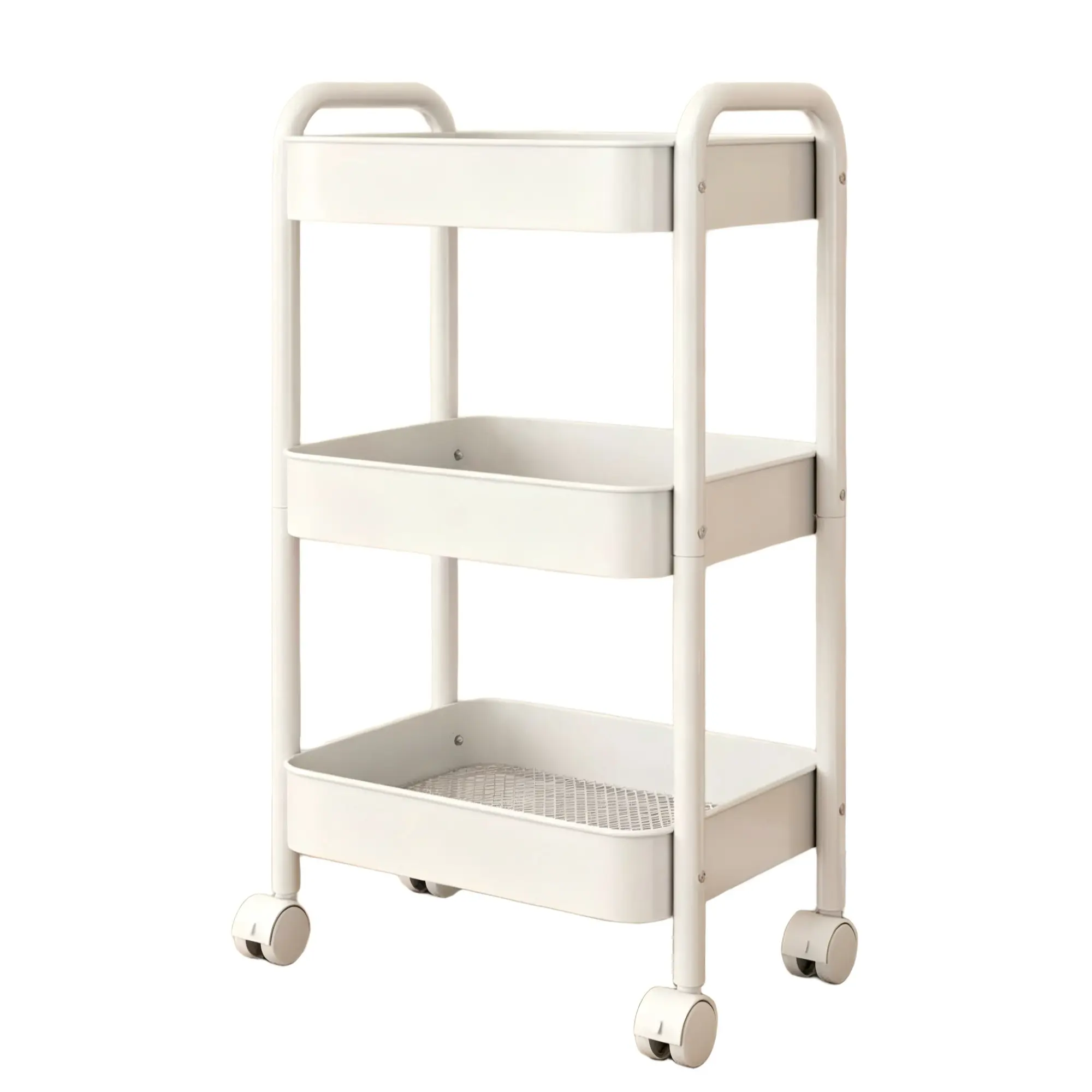 Easy Assembly Mobile Storage Trolley with Lockable Wheels No complicated tools needed! Assemble this rolling cart in minutes, then roll it to any room in your home. Lockable wheels keep it securely in place, 3 tier baskets provide ample storage, and a sleek white finish matches any decor. The best mobile storage trolley for busy households!