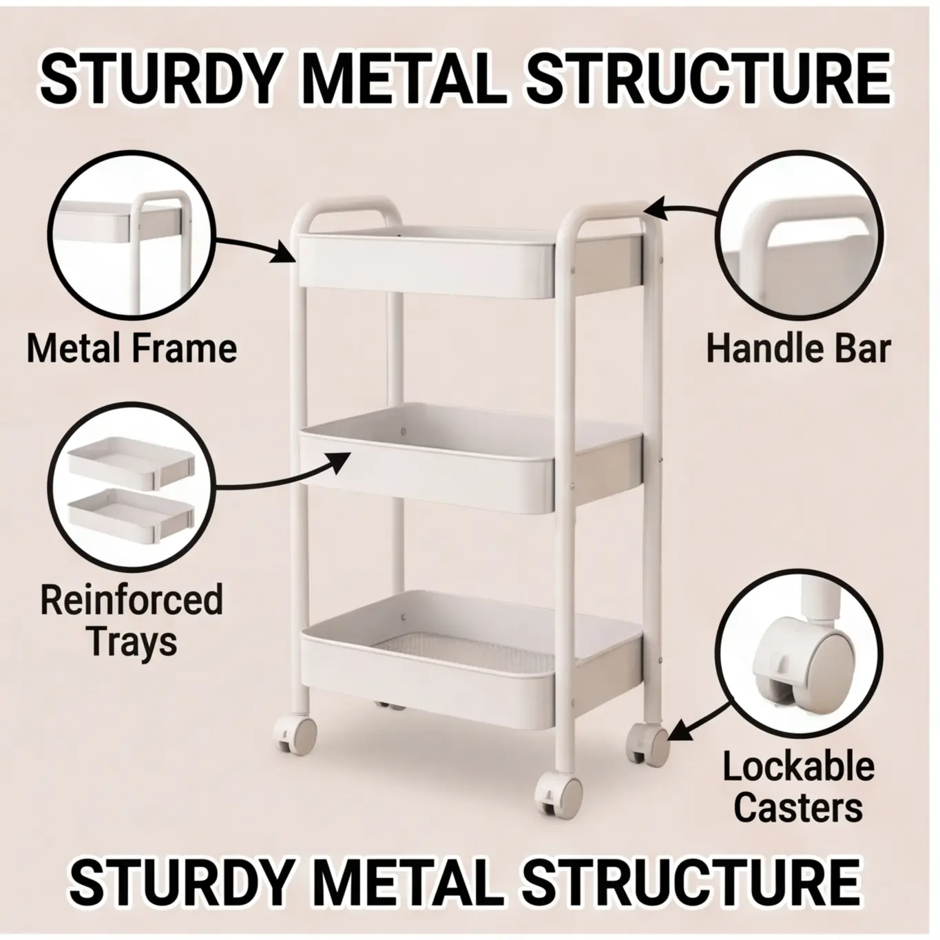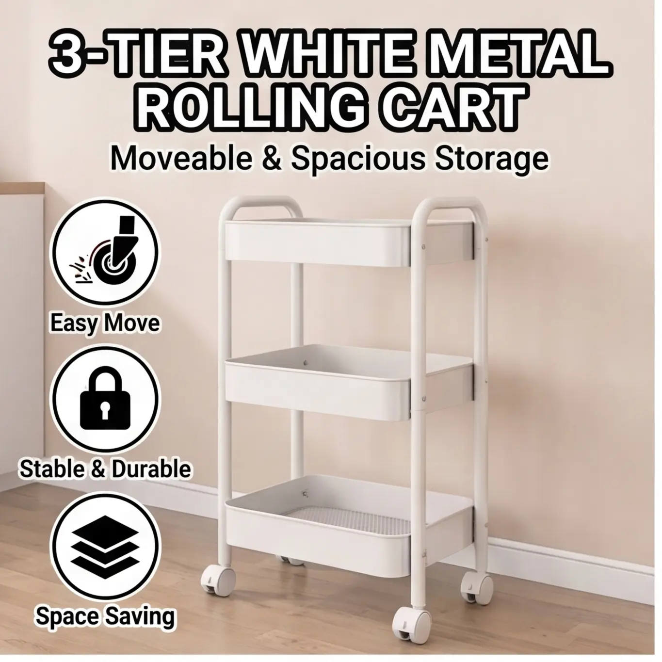 3-Tier Heavy-Duty Rolling Utility Cart Maximize your storage space with this premium metal rolling cart! 3 deep baskets hold all your essentials, 360° swivel wheels (with lockable brakes) let you move it anywhere, and a sturdy handle for easy maneuvering. The ultimate rolling utility cart for kitchen, bathroom, office, and small spaces!