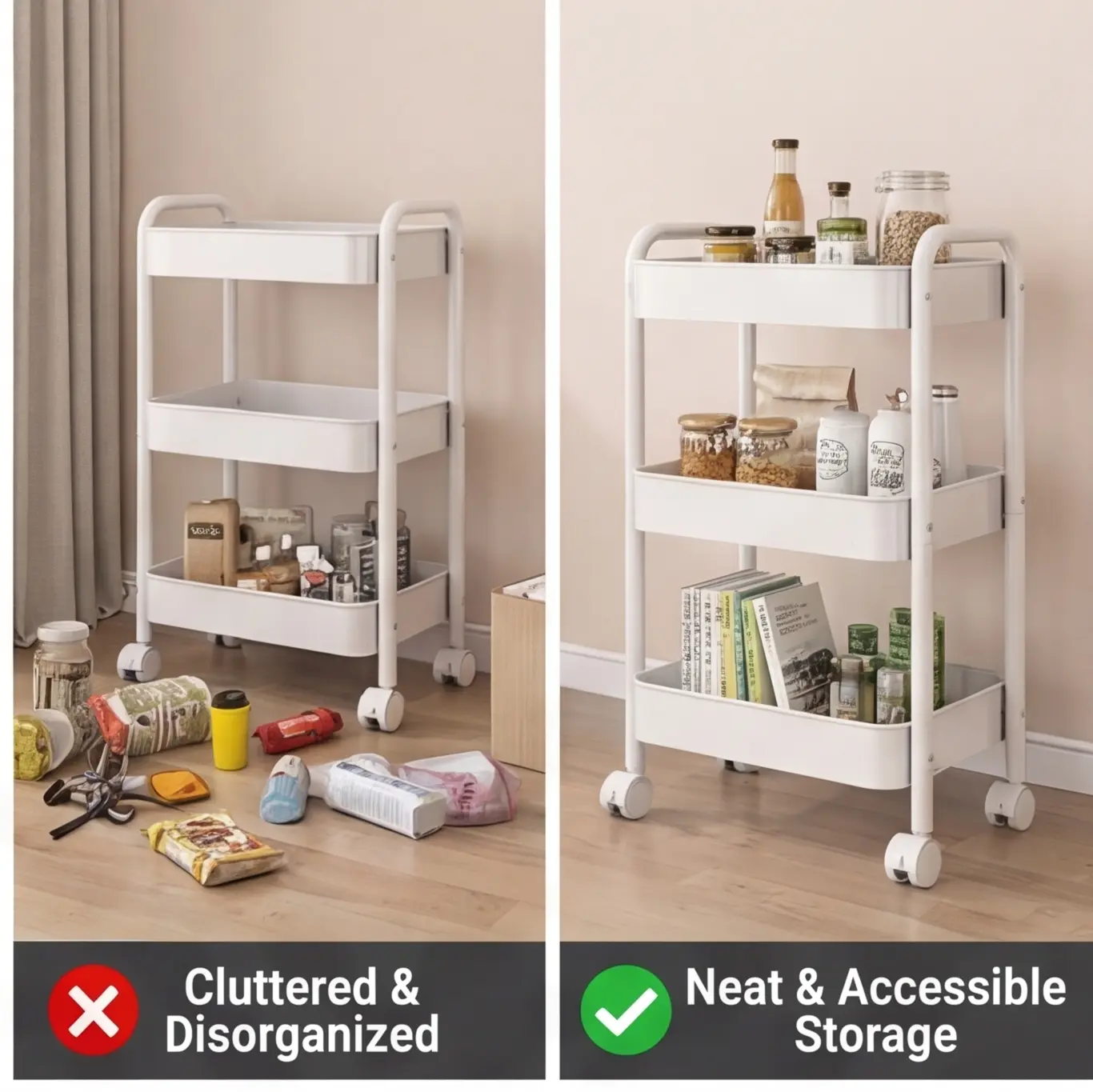 Space-Saving 3 Tier Rolling Shelving Unit Transform cluttered spaces with this compact, high-capacity rolling cart! Ideal for dorms, apartments, and small homes, it fits in narrow gaps, under cabinets, and next to desks. Sturdy metal frame supports heavy items, smooth-rolling wheels make moving a breeze. The top-rated rolling shelving unit for home organization!