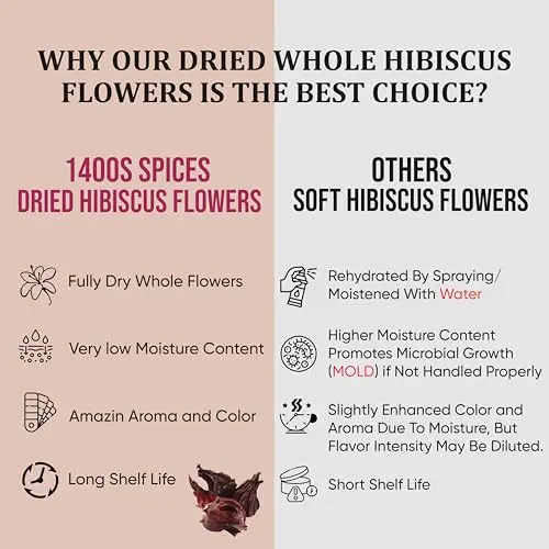 Your Cooking Secret: Edible dried hibiscus flowers are extensively used in Indian and Mexican cuisine. Impress your guests with the unique aroma of your Indian sauces and marinades. Add 1400S SPICES Hibiscus Flowers to your favorite quesadilla, enchilada or even taco recipe and marvel at the result