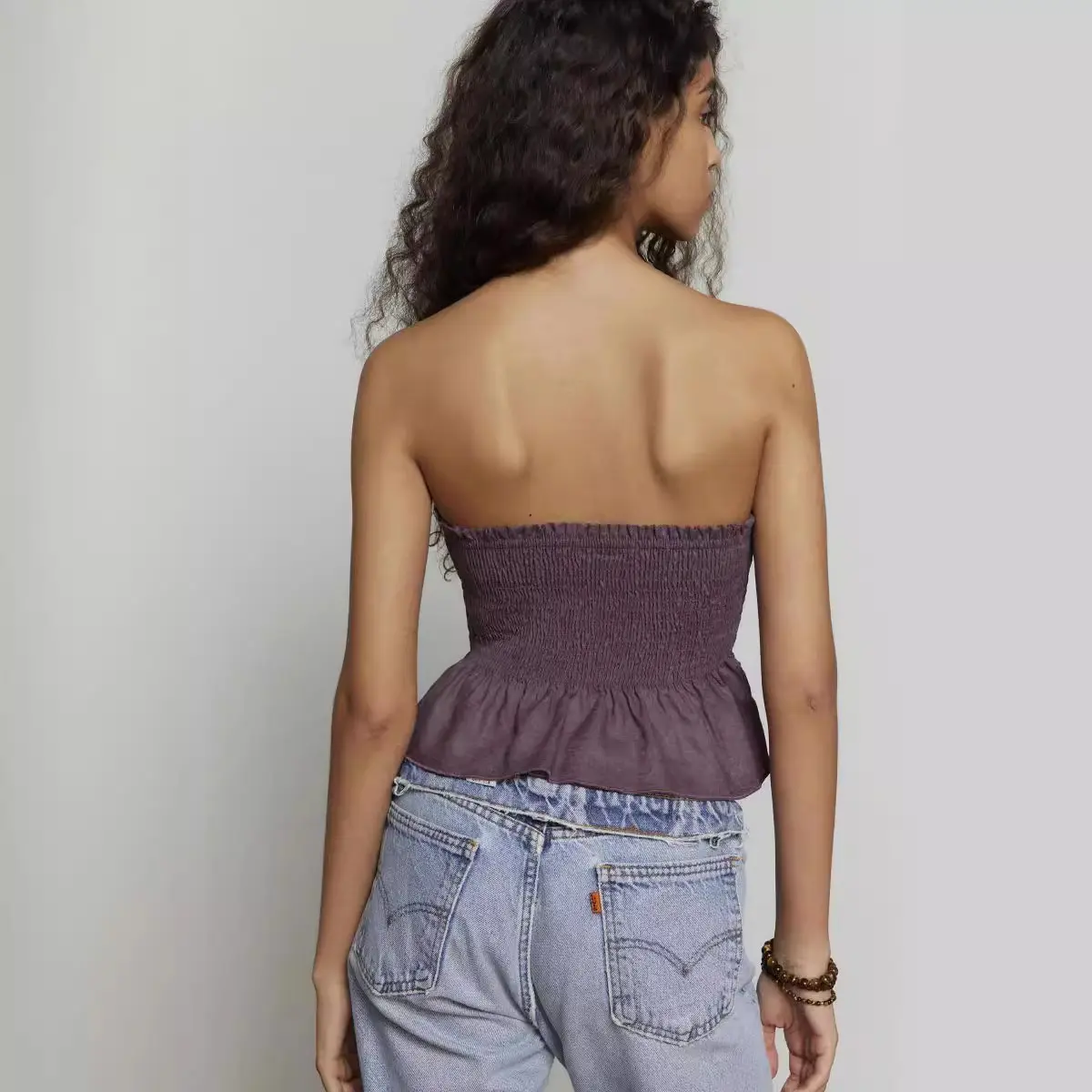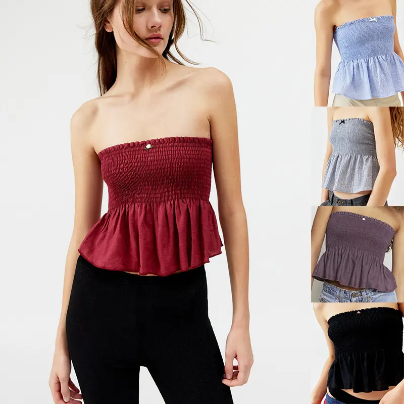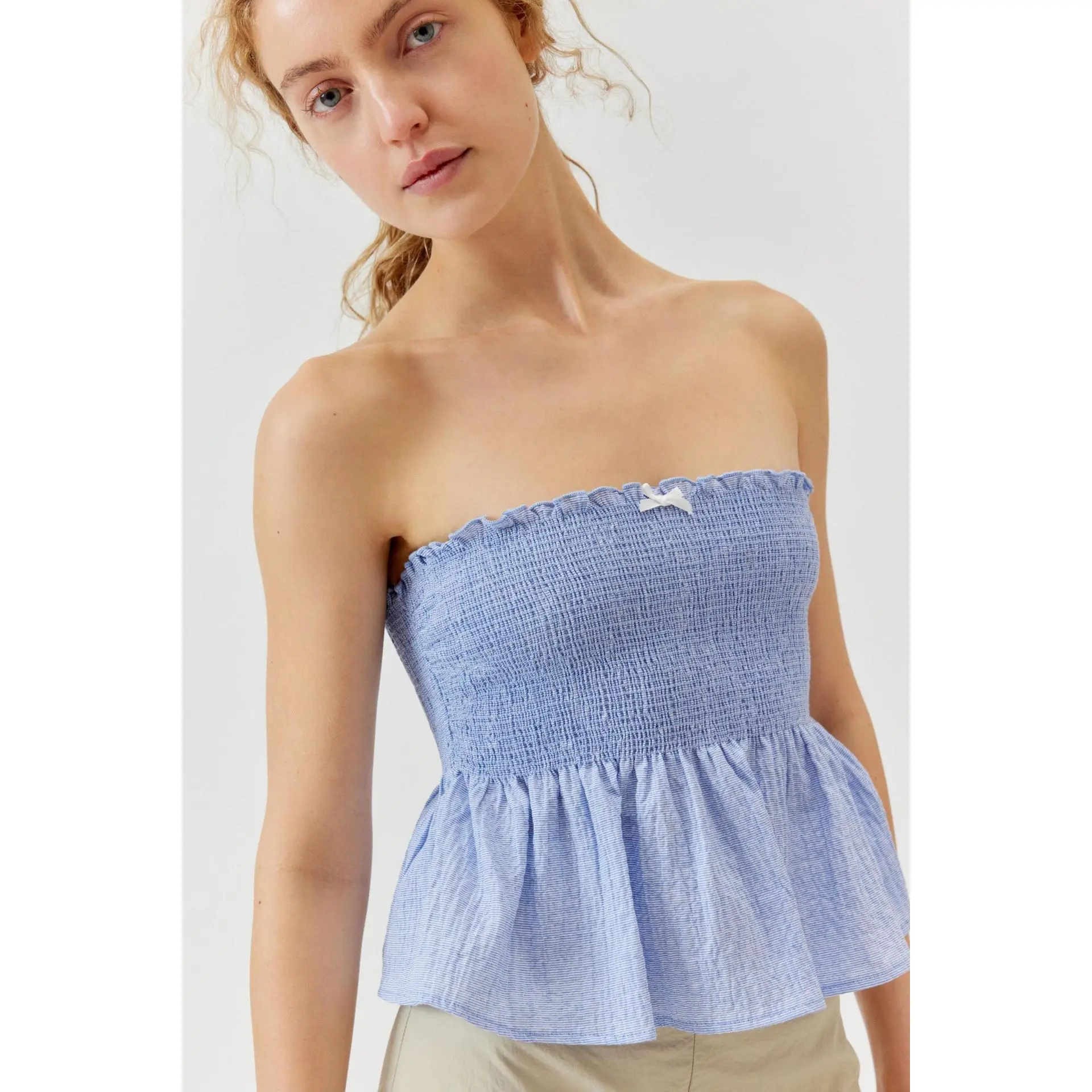 GGFL Women's Blue & White Stripe Smocked Tube Top, Strapless Ruffle Hem Peplum Crop Top for Summer.Elegant Light Blue Stripe Smocked Strapless Top, Shirred Ruffle Hem Peplum Crop Top for Daily Wear