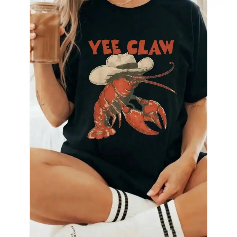 Cowboy Crawfish Vintage Oversized Graphic T-Shirt Beachwear Summer Vacation Western Style Funny Lobster Tee Casual Streetwear Coastal Aesthetic Soft Trendy Outfit Women Holiday Fashion Cute Graphic Tee Comfortable Loose Fit Summer Top Beach Outfit Street