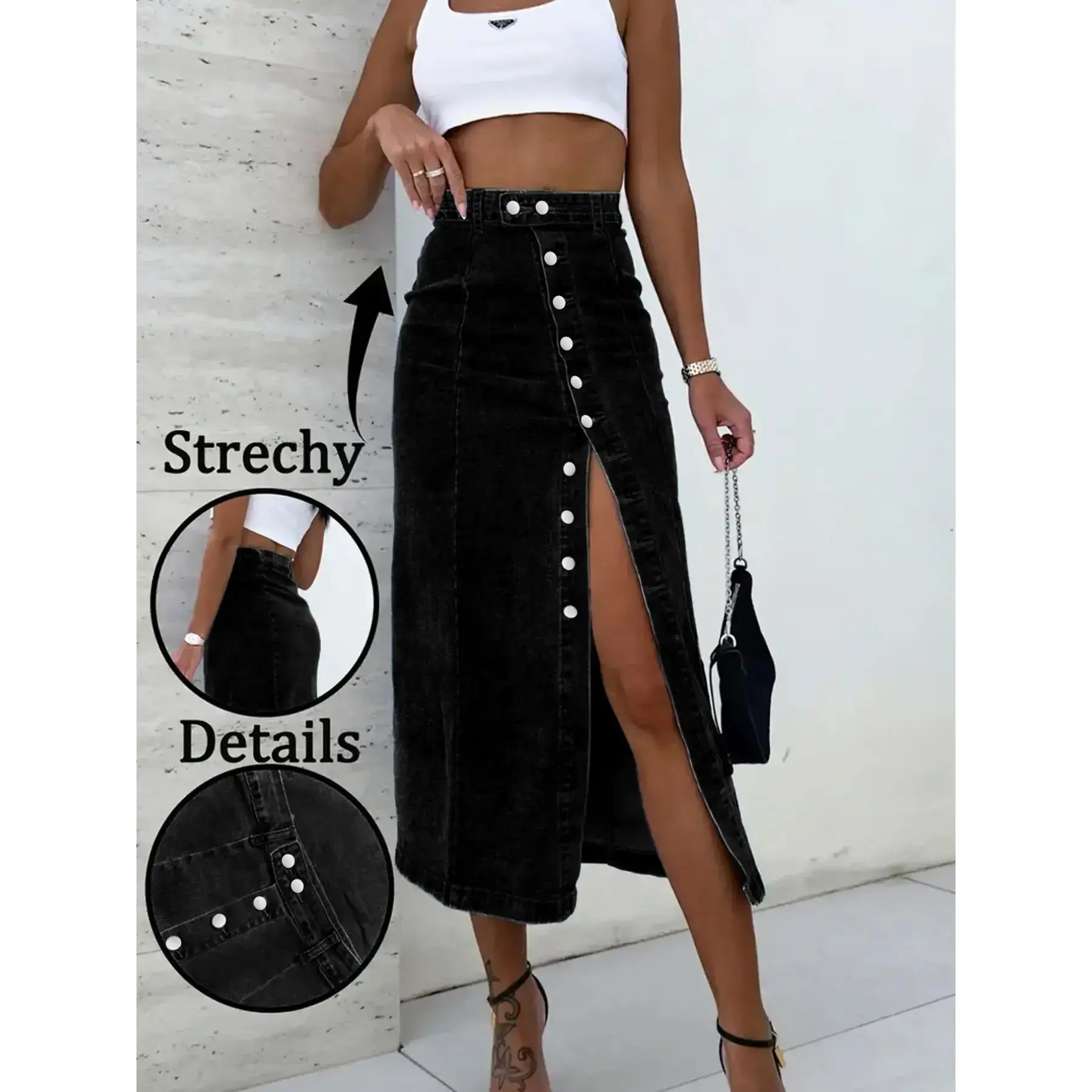 Women’s Elastic Washed Casual Fitted Denim Midi Skirt with Button Fly, Basic, Suitable for All Seasons, Perfect for Dating and Everyday Wear