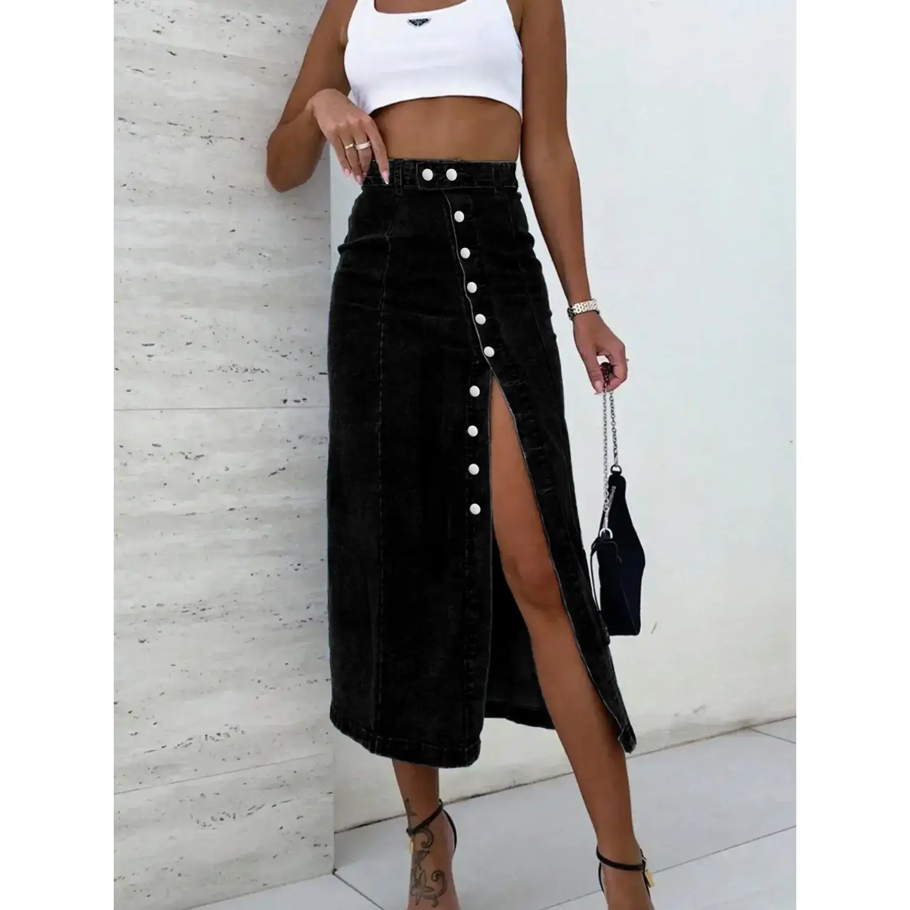 [Button Flying Closure]: Equipped with a secure button fly closure, ensuring reliable wear and easy access while maintaining a polished look. [Fitted Silhouette]: Featuring a fitted silhouette that flatters various body shapes, enhancing your profile for a confident appearance. [Midi Length]: The midi length strikes a balance between elegance and practicality, suitable for various occasions throughout the year. [All Seasons Wear]: Designed for wear across all seasons, this skirt offers year-round versatility for various life activities. [Plain Pattern]: A plain pattern provides a classic and timeless look, allowing for easy pairing with various tops and accessories.