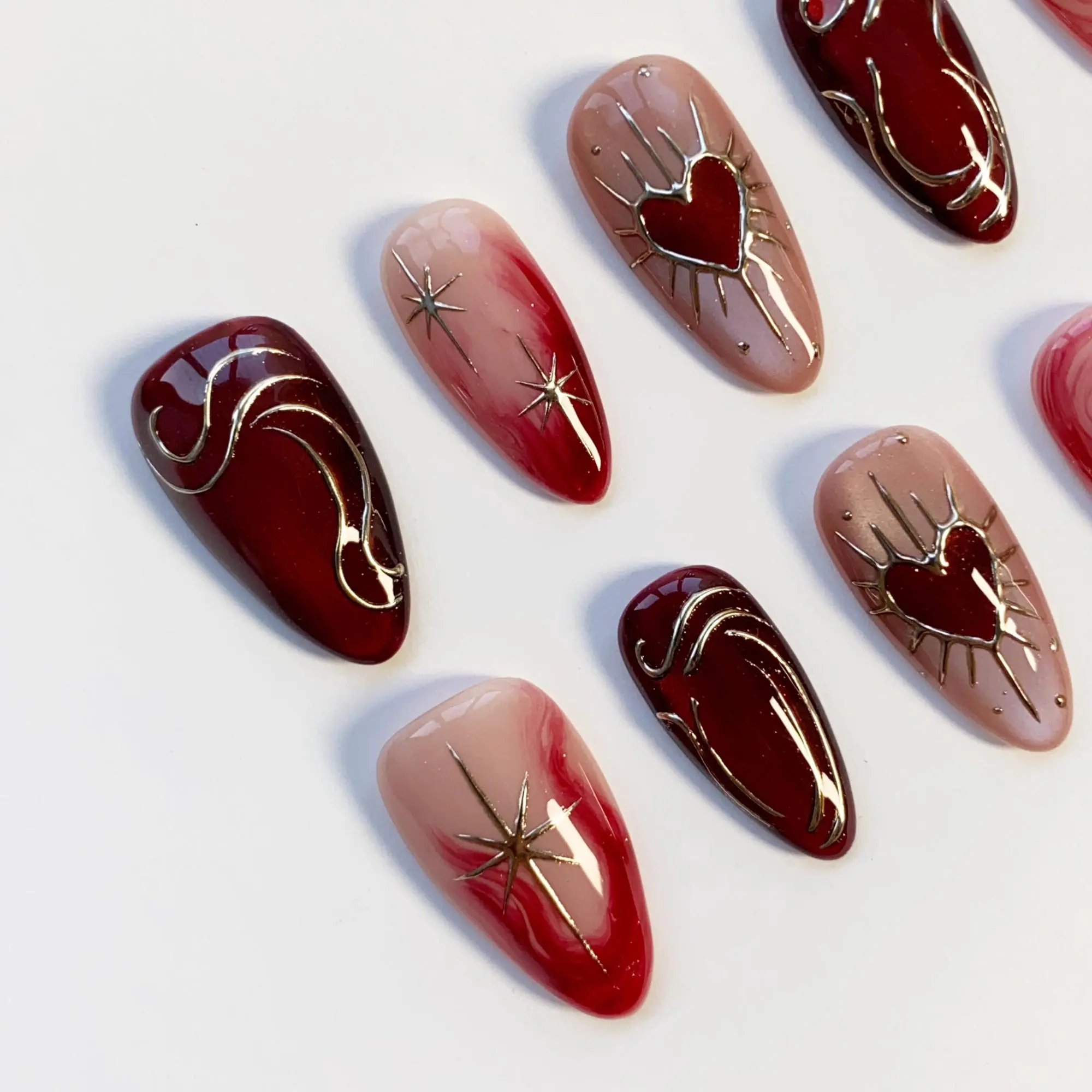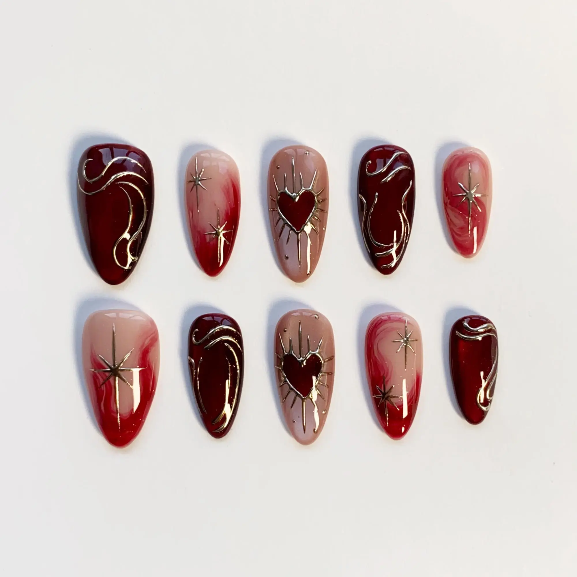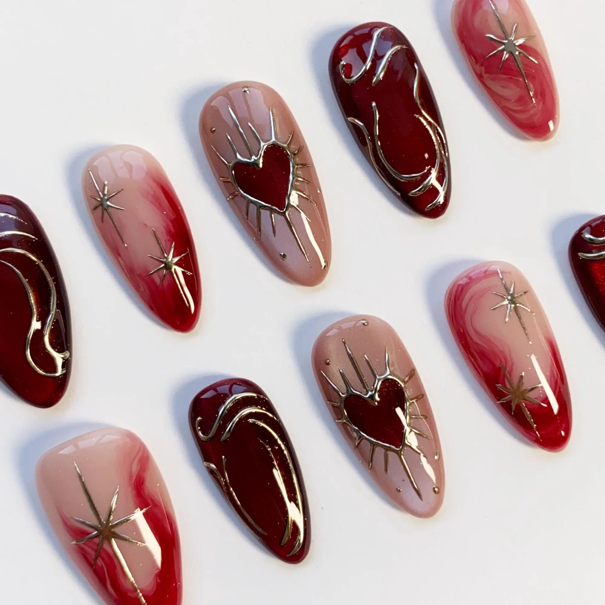 Burgundy Press on nails short almond nails/Red Cat Eye Nails/Star Nails/Red nails/3D Gold Chrome nail/Burgundy Nails/Gothic Nails/Heart Nail 3RT9NK