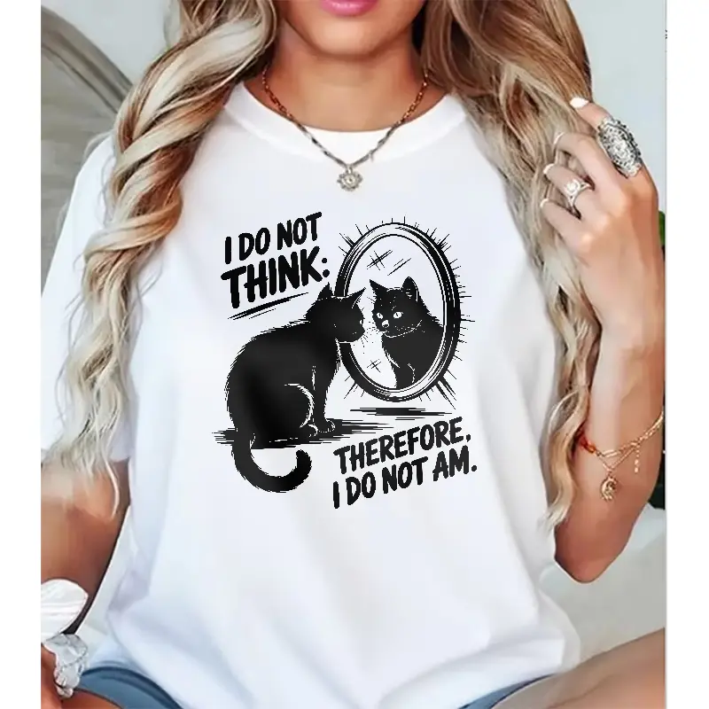 I Do Not Think Therefore I Do Not Am Black Cat Mirror Graphic Cotton Tshirt For Cat Lovers