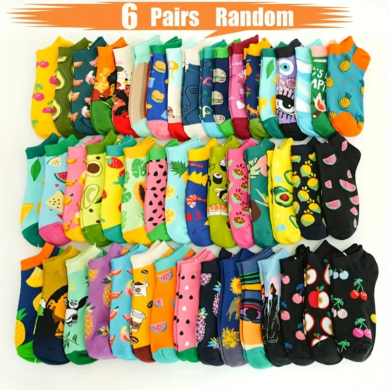 6/12 Pairs Random Men'S Ankle Socks Featuring Fruit And Vegetable Patterns - Made from Colorful Knitted, Machine Washable, Low-Cut Design Suitable for Casual Wear, Adorable Socks Perfect for Outdoor Activities. Soft, Comfortable