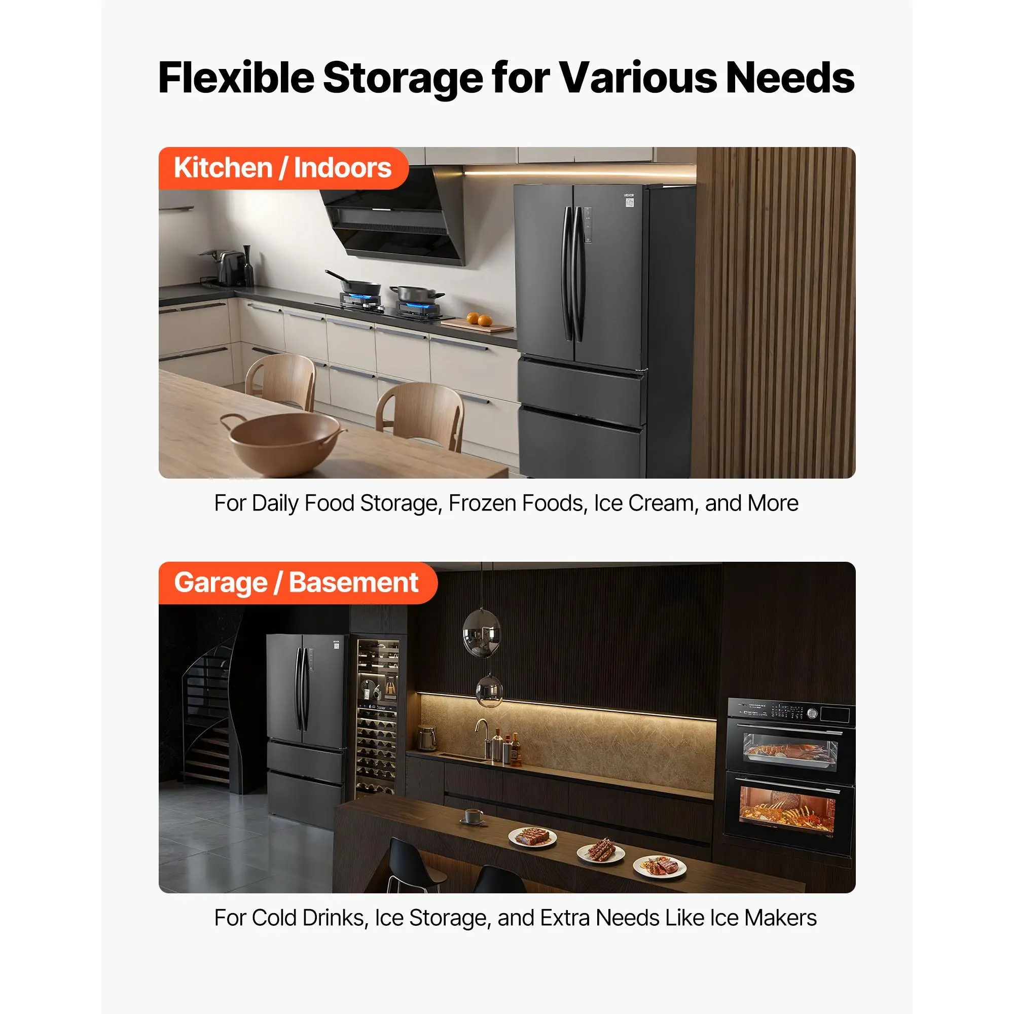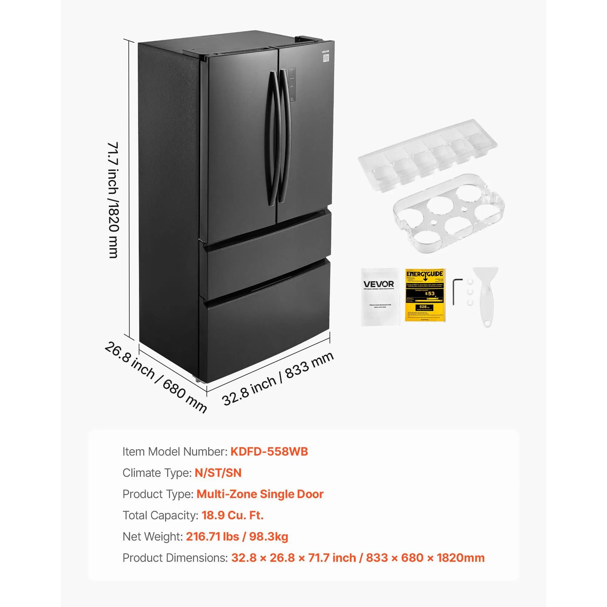 VEVOR 18.9 cu. ft French door fridge adapts to different spaces and provides precise temperature settings in the fresh food section. It supports better storage for produce and meats by maintaining moisture, helping your food stay fresh and flavorful for extended periods.