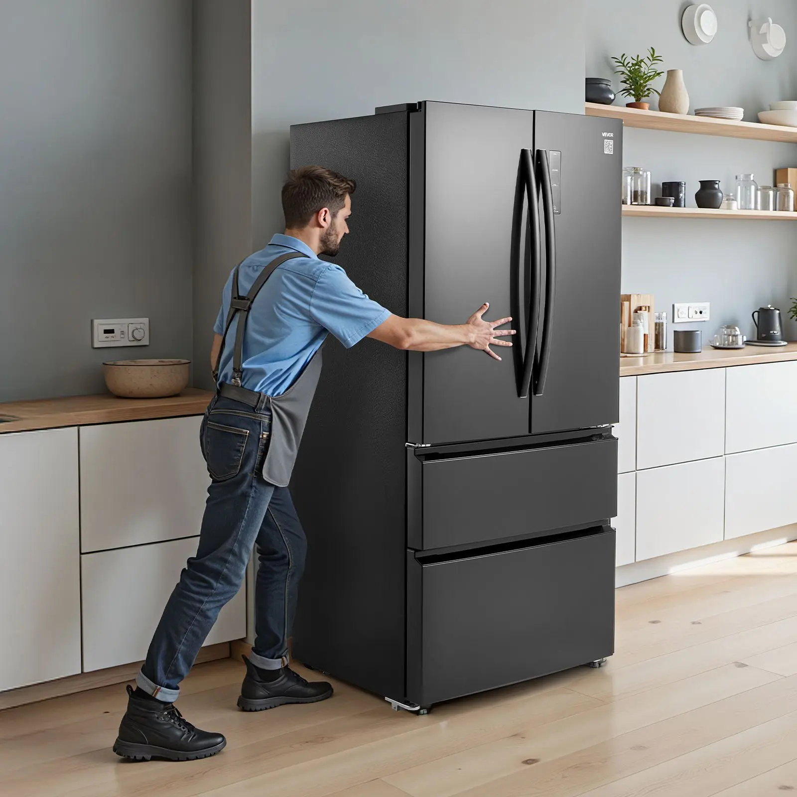 VEVOR French door fridge offers a clean, modern appearance that fits seamlessly into most dcor styles. The exterior surface wipes clean with minimal effort. Equipped with four wheels-two of them swiveling-you can move it effortlessly when needed.