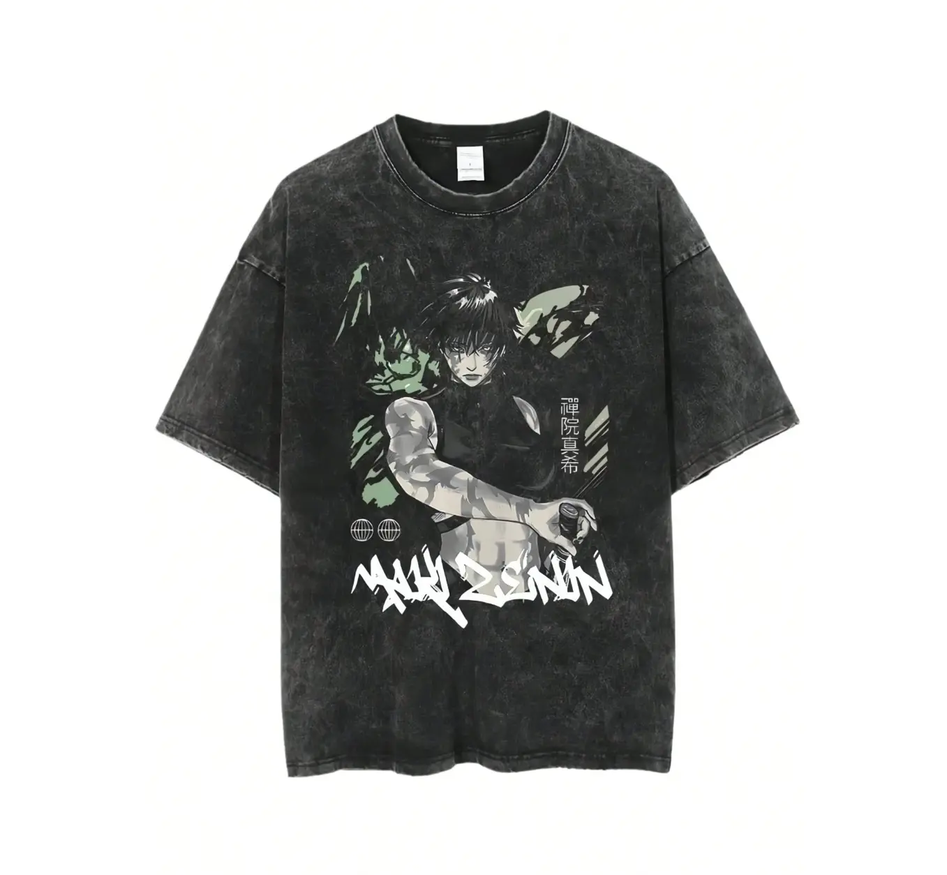 Rep the iconic Jujutsu Kaisen character Maki Zenin with this stunning vintage-style action tee! Featuring a striking illustration of Maki in her iconic battle pose, paired with bold Japanese text (Zenin Maki) and stylized "MAKI ZENIN" lettering. This shirt captures the raw, powerful energy of the strongest non-sorcerer in Jujutsu Kaisen history. Ideal for JJK stans, anime fans, or anyone who loves vintage anime streetwear.