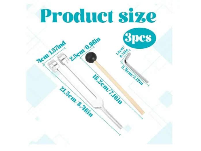 ·Dimensions: Tuning fork: 8.46 inches x 0.98 inches. Mallet: 7.16 inches. Hex key: 2.12 inches.