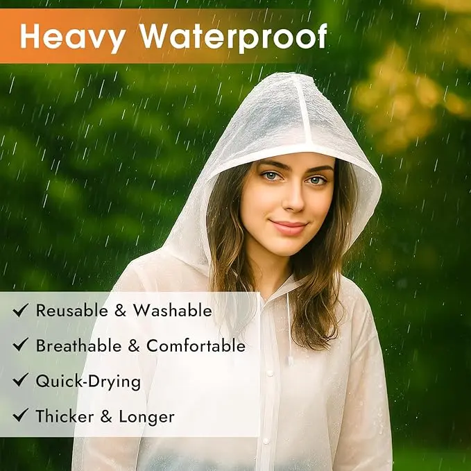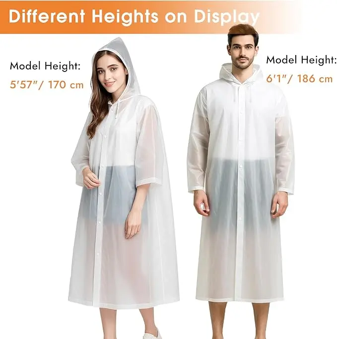 Upgraded Functional Design – Features a drawstring hood and secure snap-button closure for enhanced protection against rain while allowing quick and easy wear. The transparent design makes it ideal for both light showers and heavy rain.