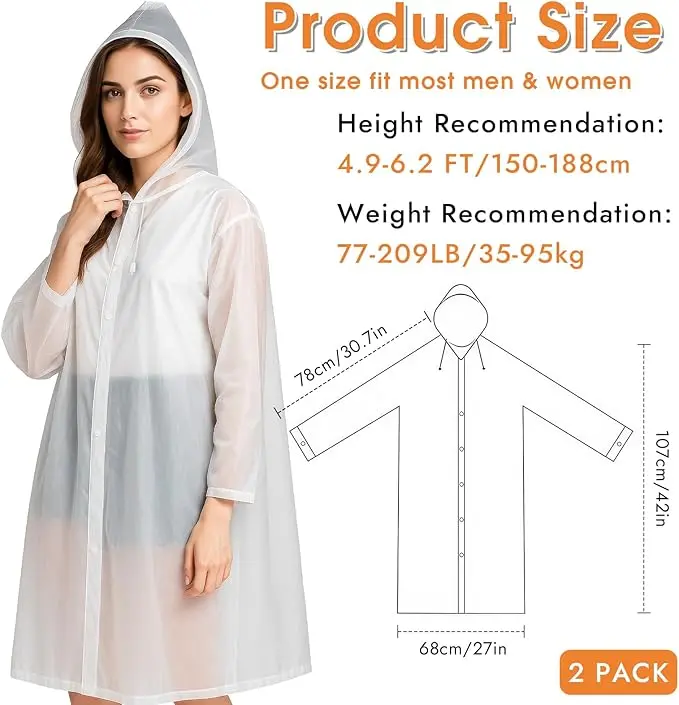 2-Piece Rain Poncho Set – Each poncho measures 63 inches in total length, with a 49-inch body, 27.5-inch sleeves, and a 13-inch hood. The 27.5-inch chest width provides a comfortable, relaxed fit suitable for both men and women.