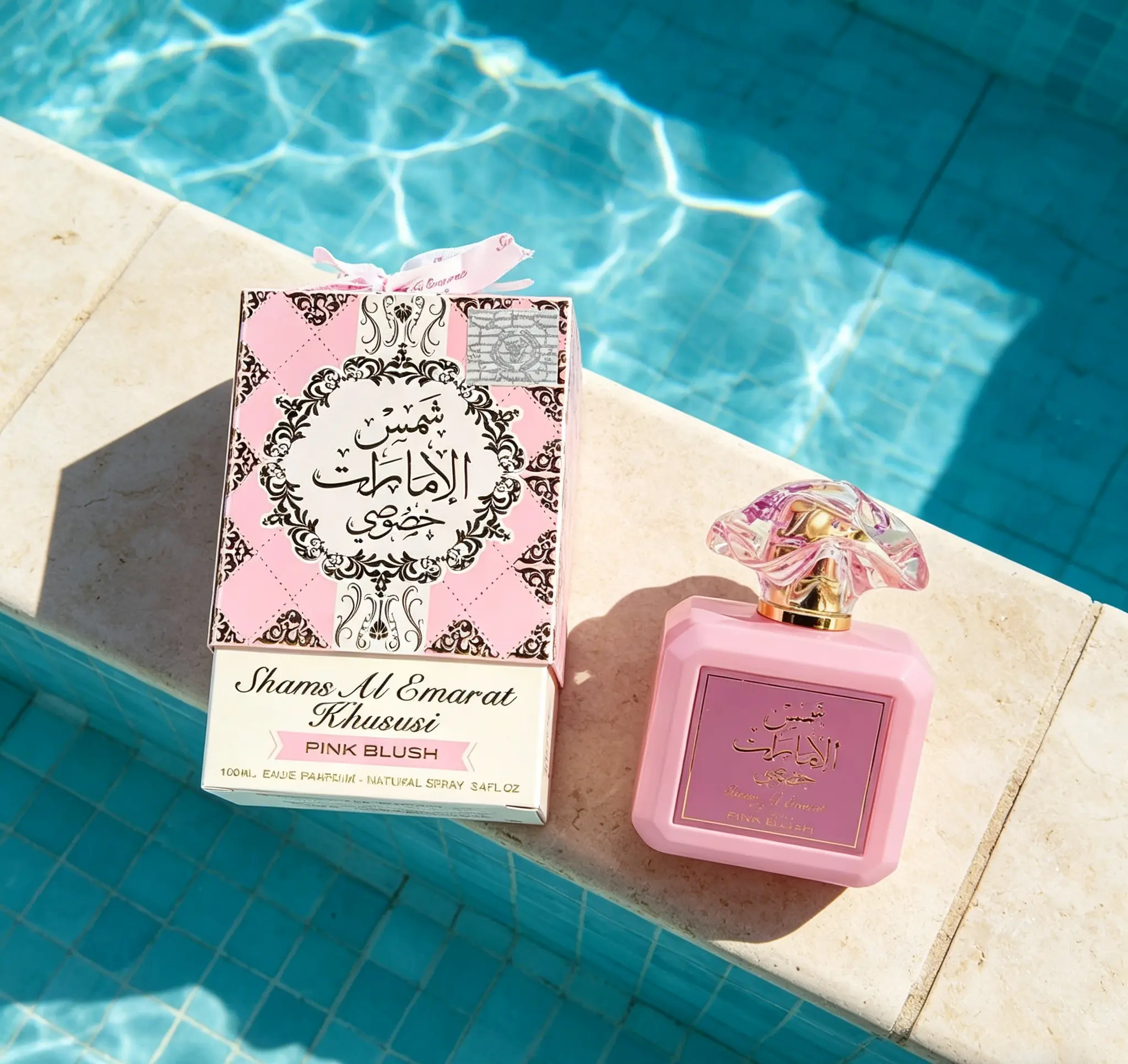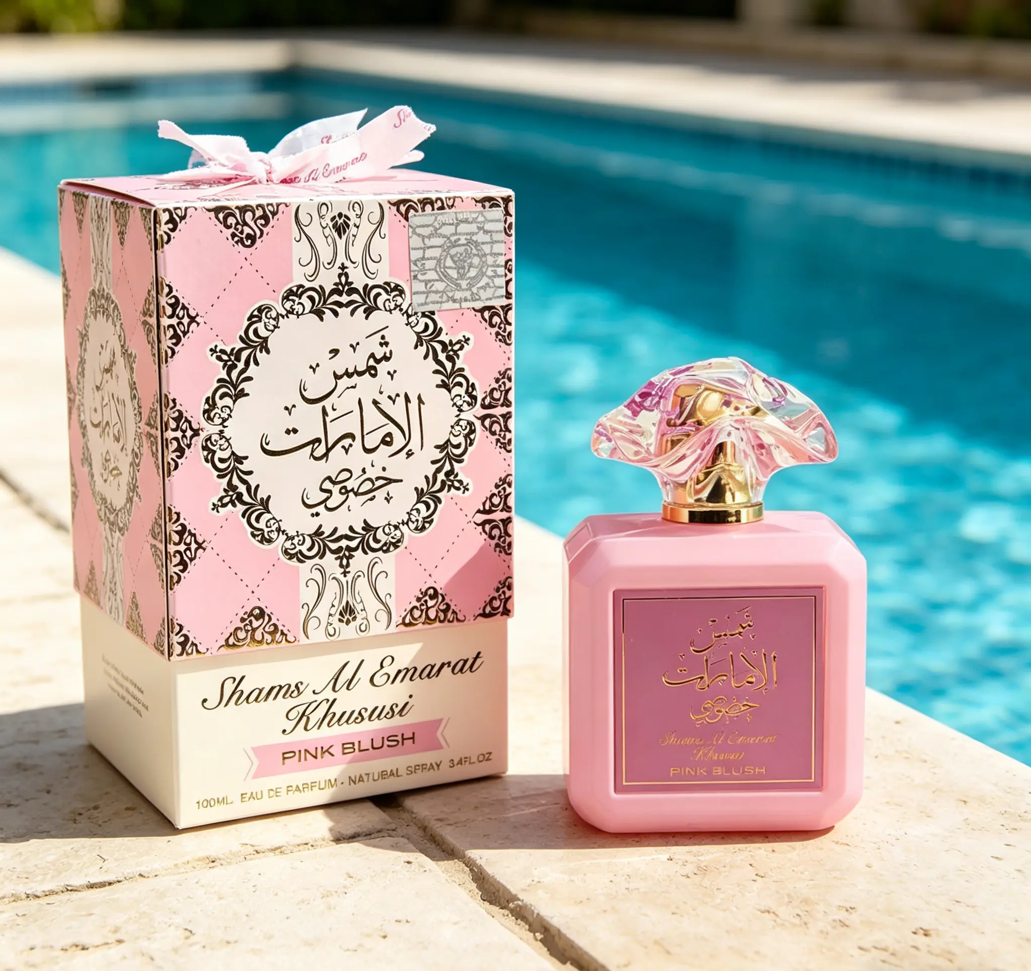 Luxury Pink Arabian Bottle — Stunning pink blush design with elegant Arabic detailing, a glamorous statement piece for any vanity.