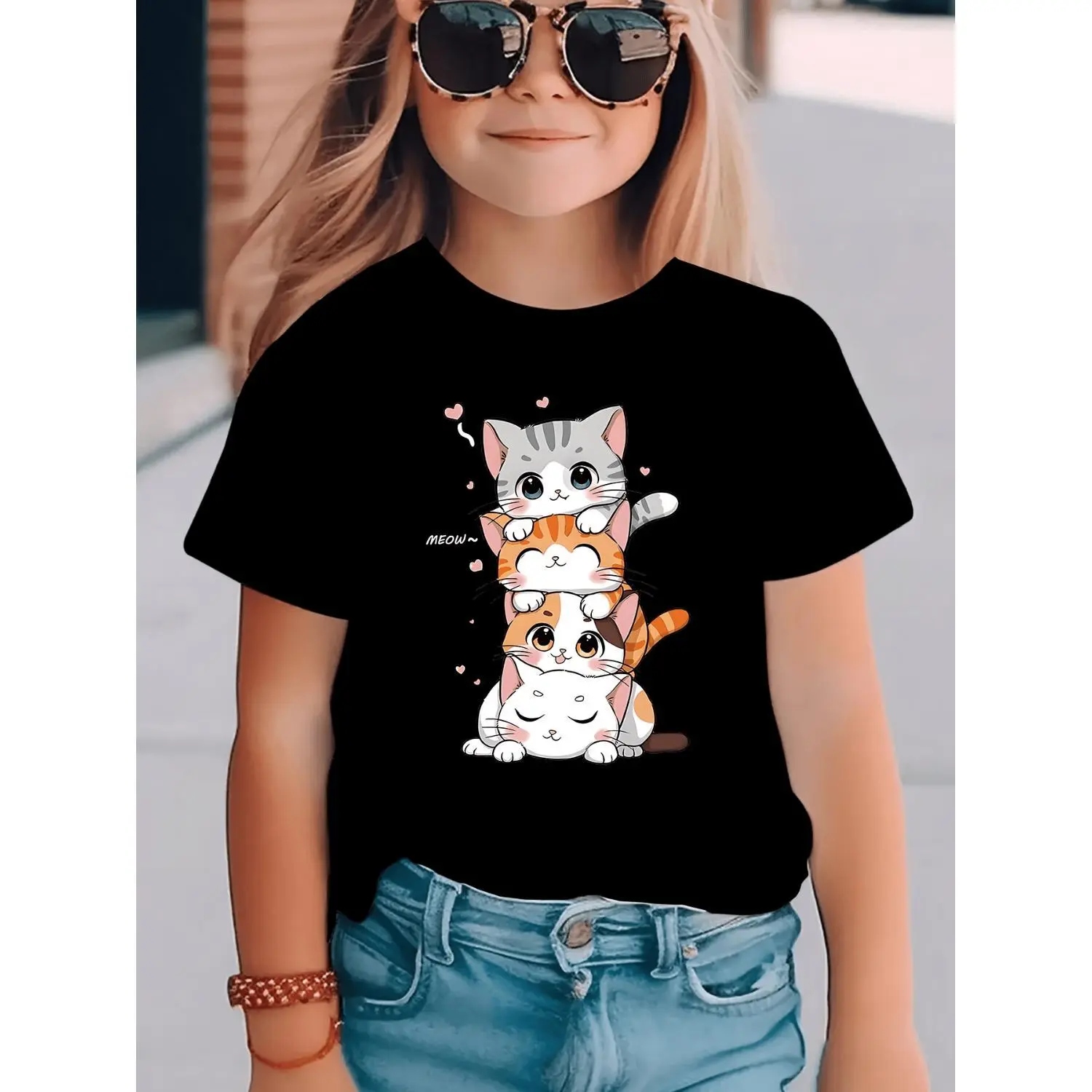 Summer Fashion Girls Short Sleeve TShirt Featuring Cute Kitten Cartoon Print for Casual Wear