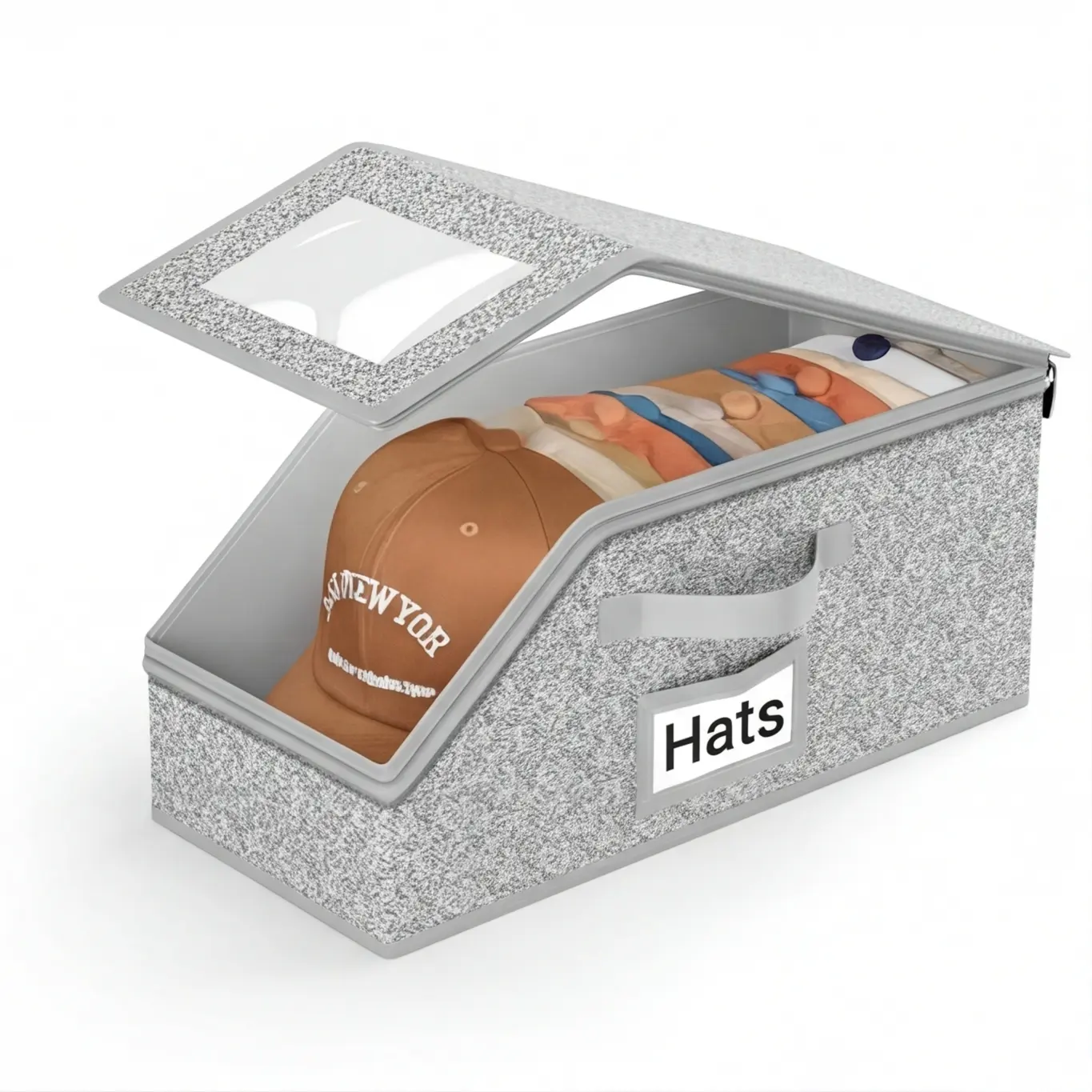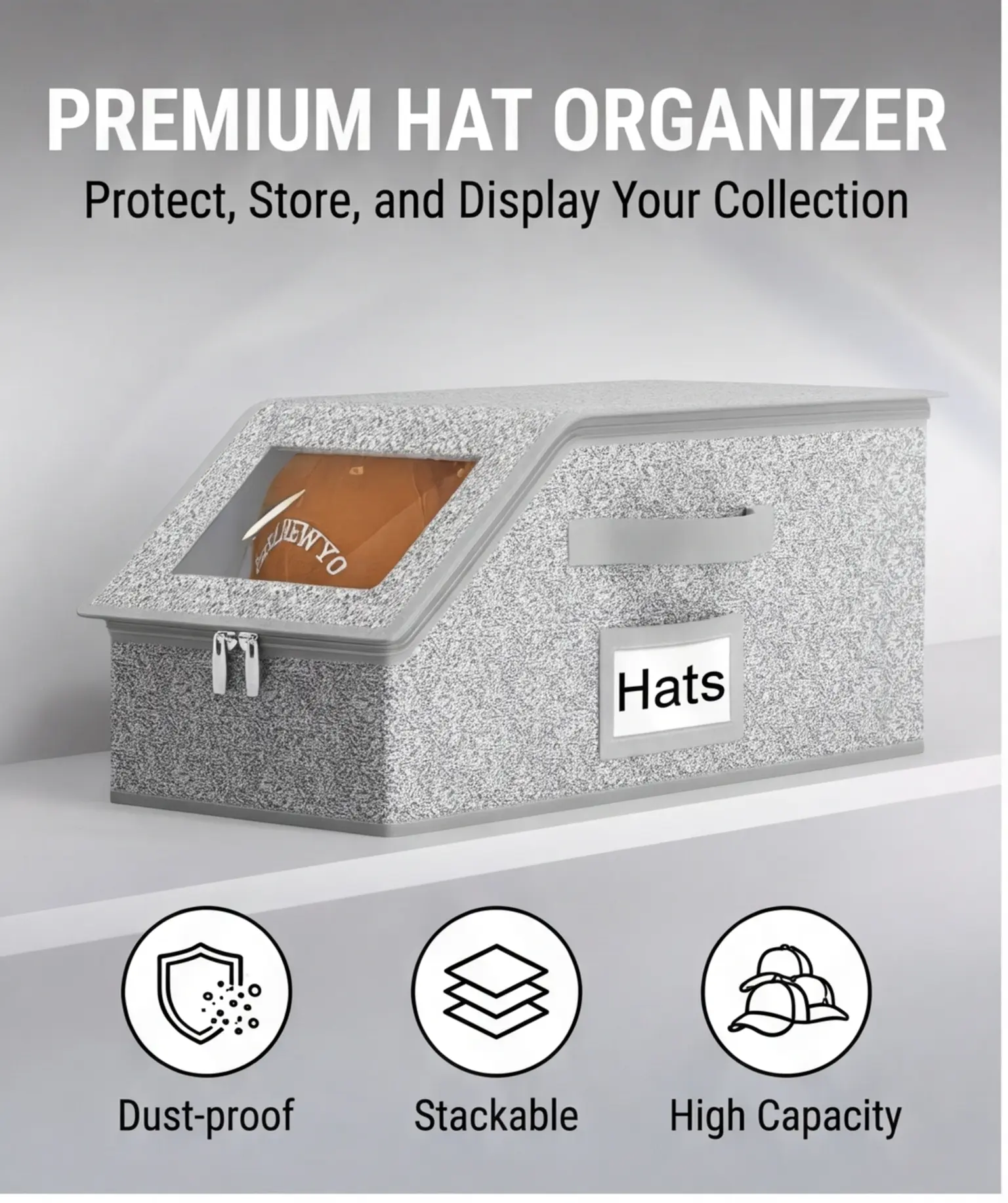 Stackable Hat Storage Box with Clear Window Keep your entire hat collection organized and dust-free! This premium hat organizer features a large clear window to see all your baseball caps, snapbacks, and beanies at a glance, stackable design maximizes closet space, and a sturdy handle for easy access. The ultimate hat storage box for hat collectors!