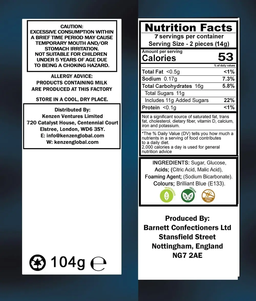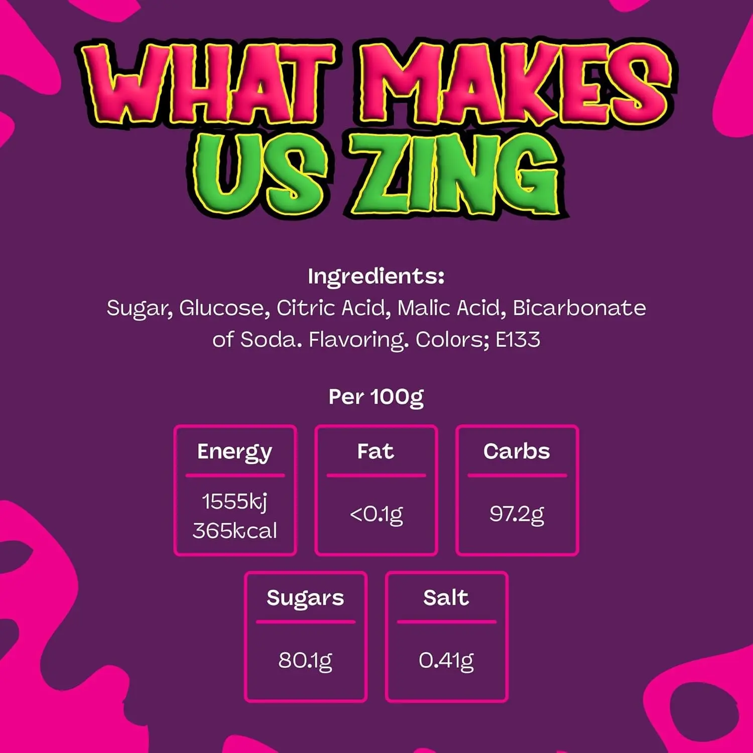 Sugar,Glucose,Citric Acid,Malic Acid,Bicarbonate of Soda,Flavouring,Colours (E133).