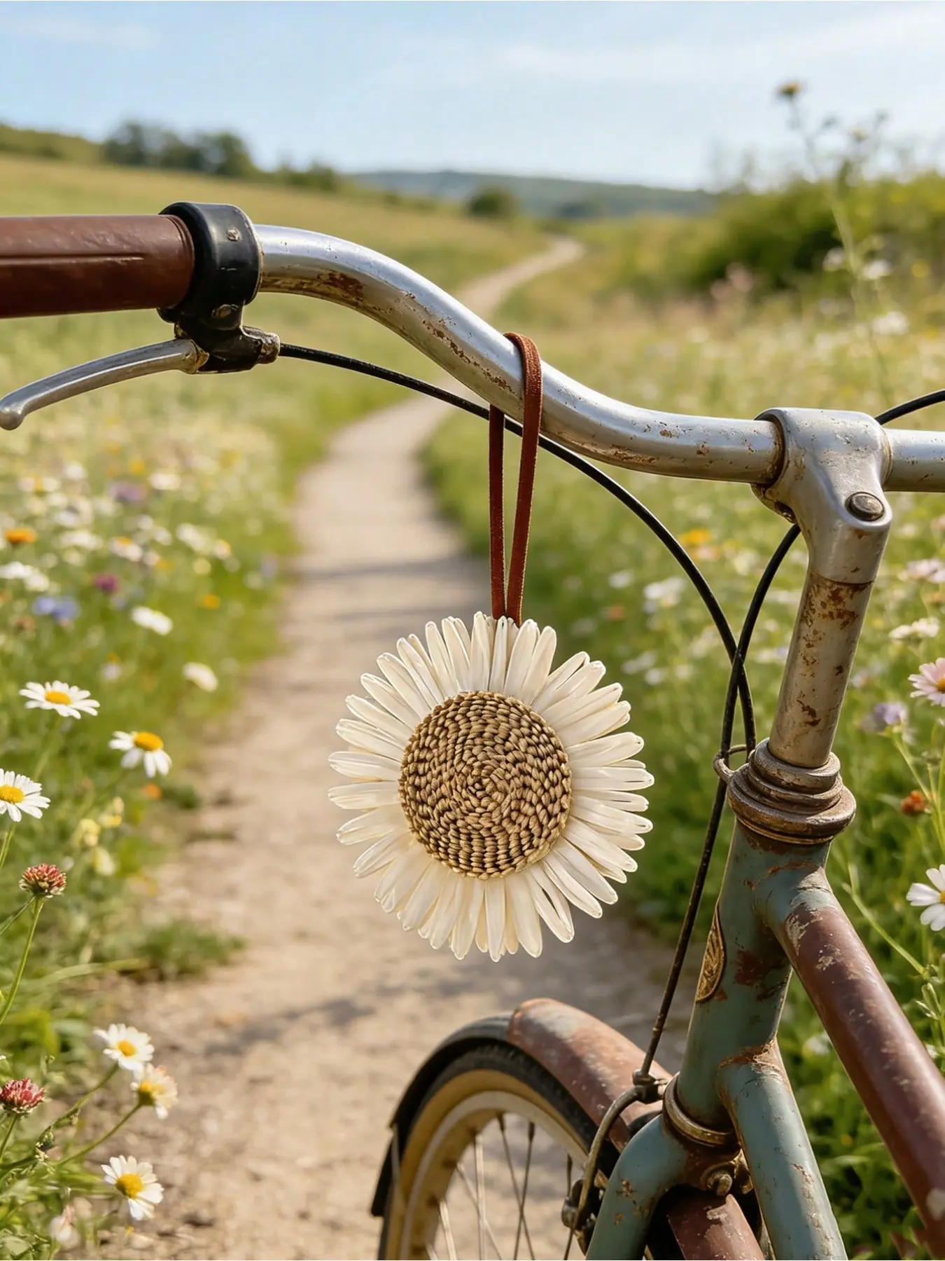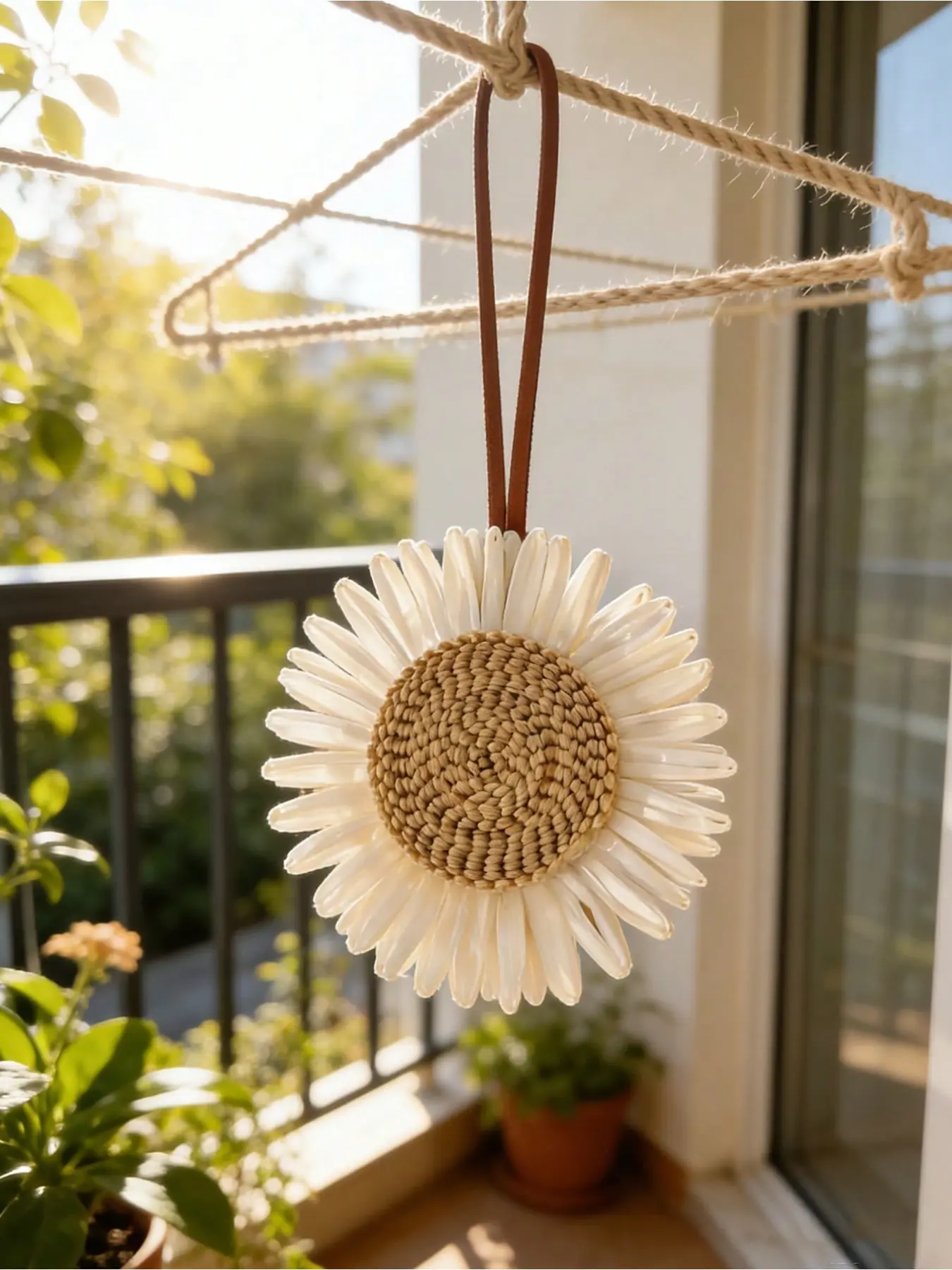 Summer bohemian resort style bag accessories, braided rattan sunflower flower designer pendant. Comes with a genuine leather strap, bohemian beach style accessory for tote bags, wallets, backpacks and keychains, elegant summer decorative pendant.