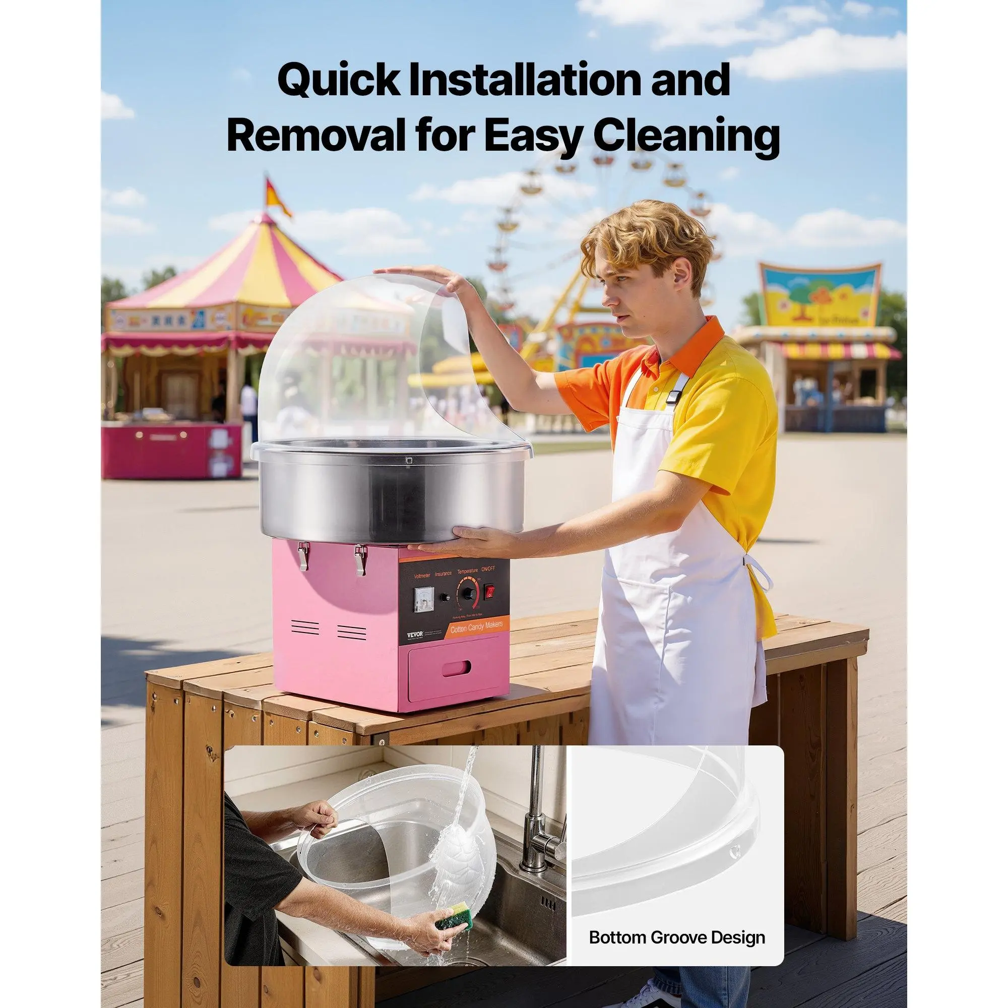 Designed with a convenient groove at the base, this cotton candy dome can be quickly detached for easy washing. The smooth, one-piece finish leaves no tricky corners, helping you keep your candy-making area spotless and making post-use cleanup effortless every time.