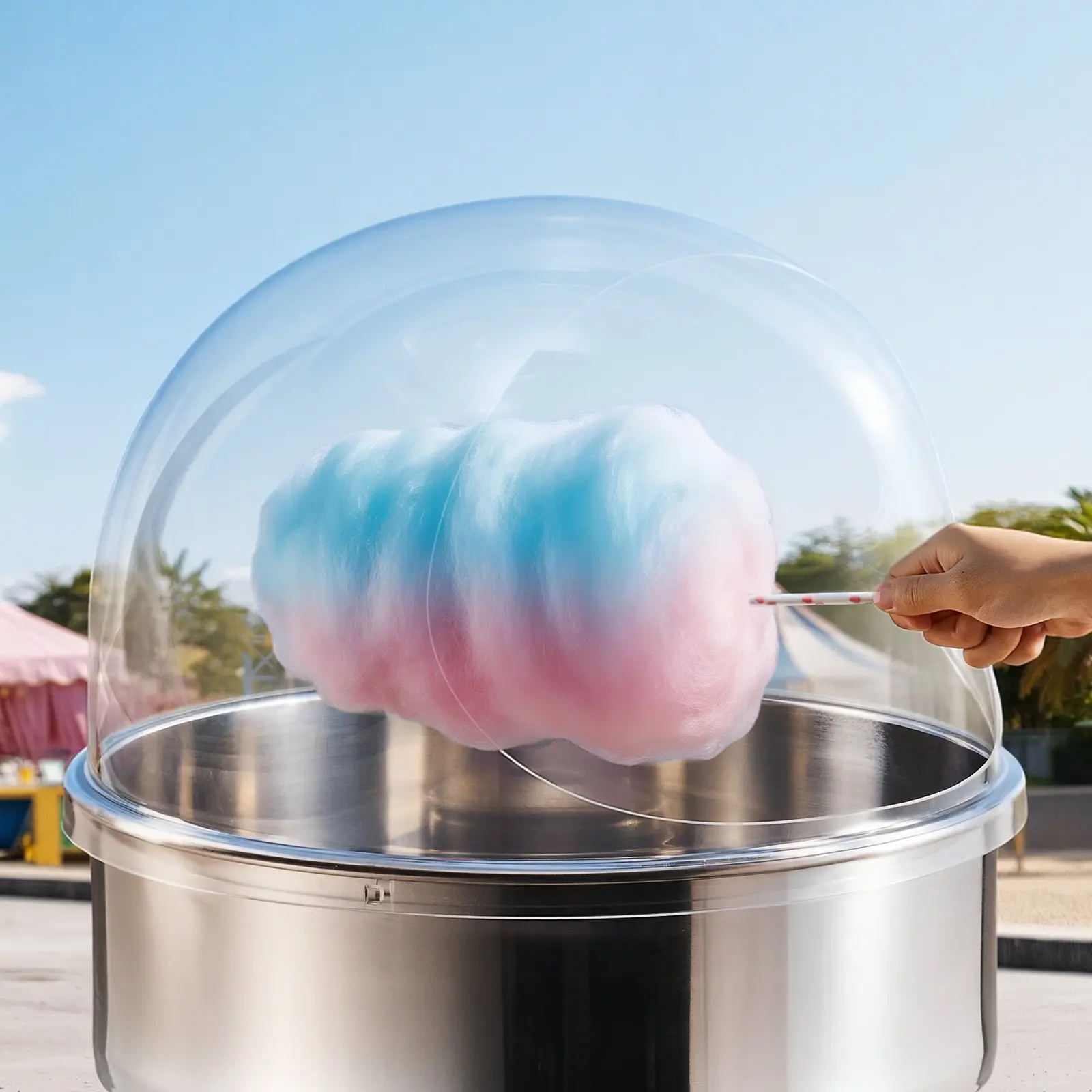 Crafted from transparent acrylic, this cotton candy dome cover offers a crystal-clear view of the spinning process. You can easily check sugar levels and monitor candy formation without lifting the lid. Its open visibility also draws customer attention, making each swirl more exciting to watch.