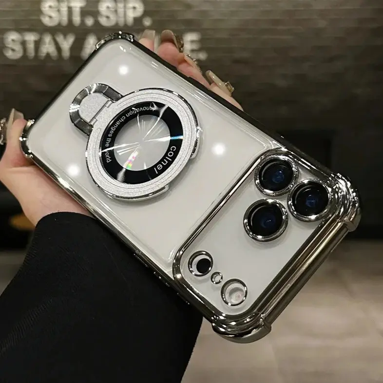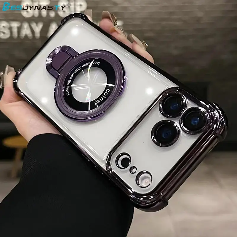 For Magsafe Wireless Charging Case For iPhone 17 Pro Max Air 14 15 Plus 13 12 16 Pro Transparent Plating Ring Holder Phone Cover