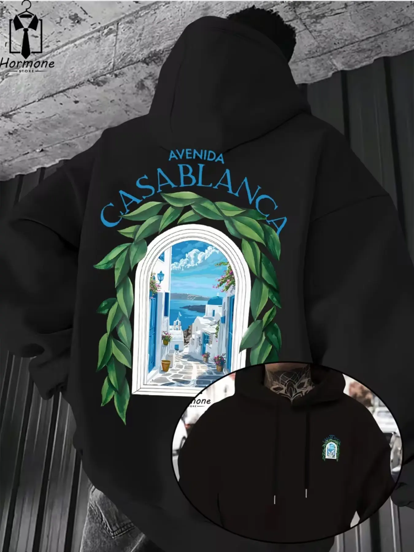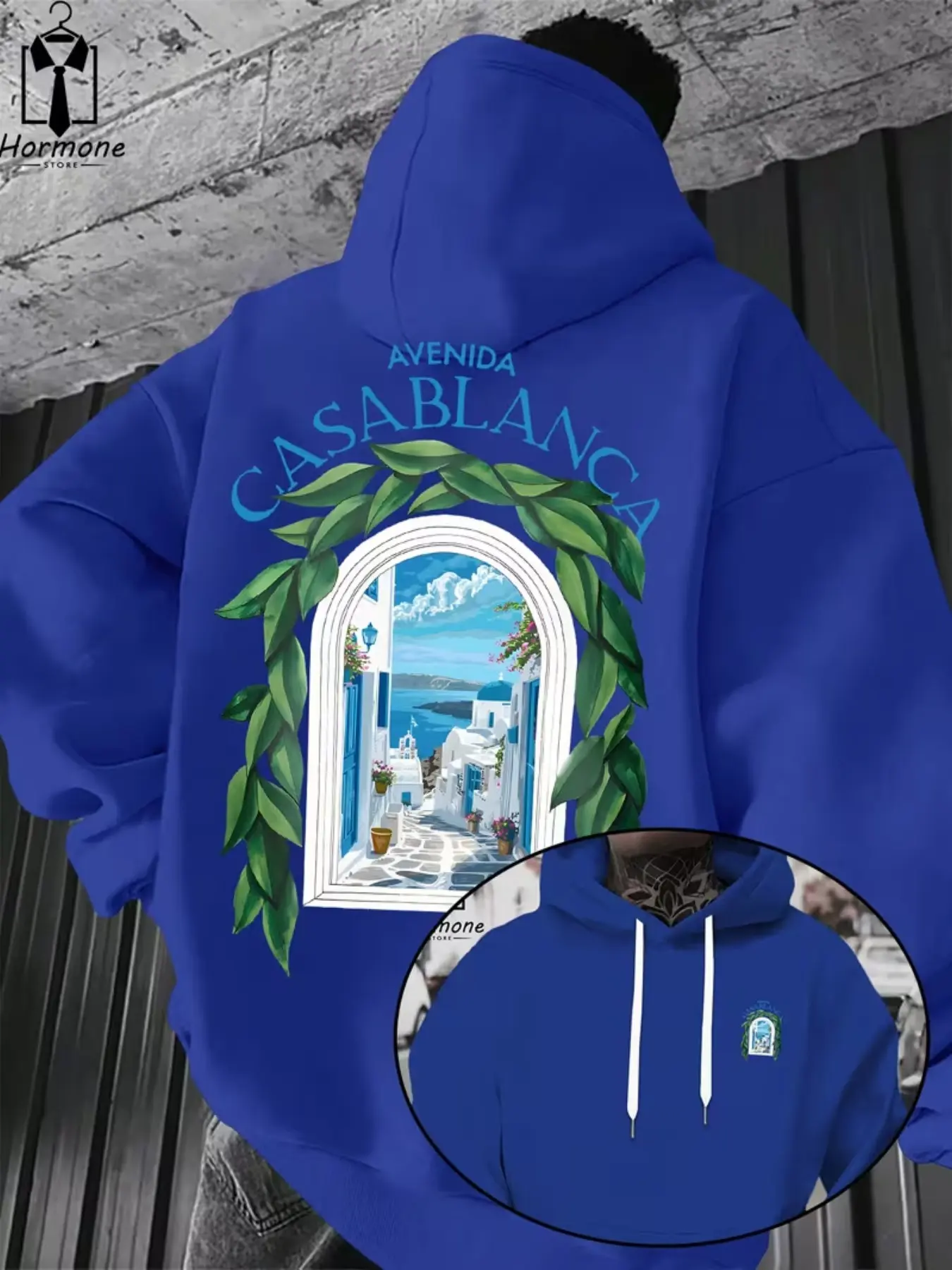Men's Casual Hooded Sweatshirt, Avenida Casablanca Text & Landscape Print, Spring Fall Warm Pullover, Kangaroo Pocket Design