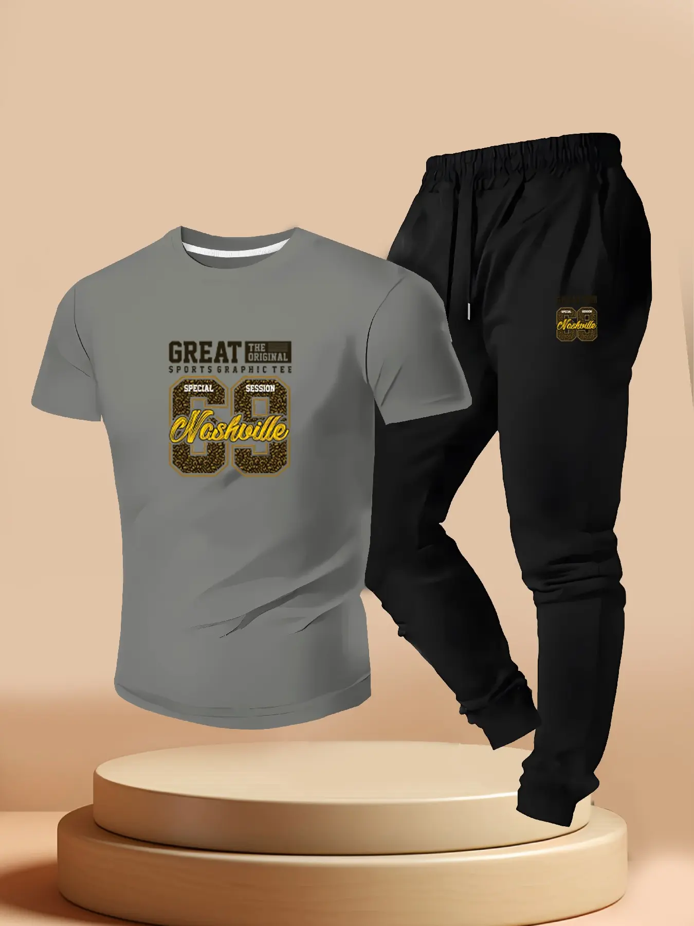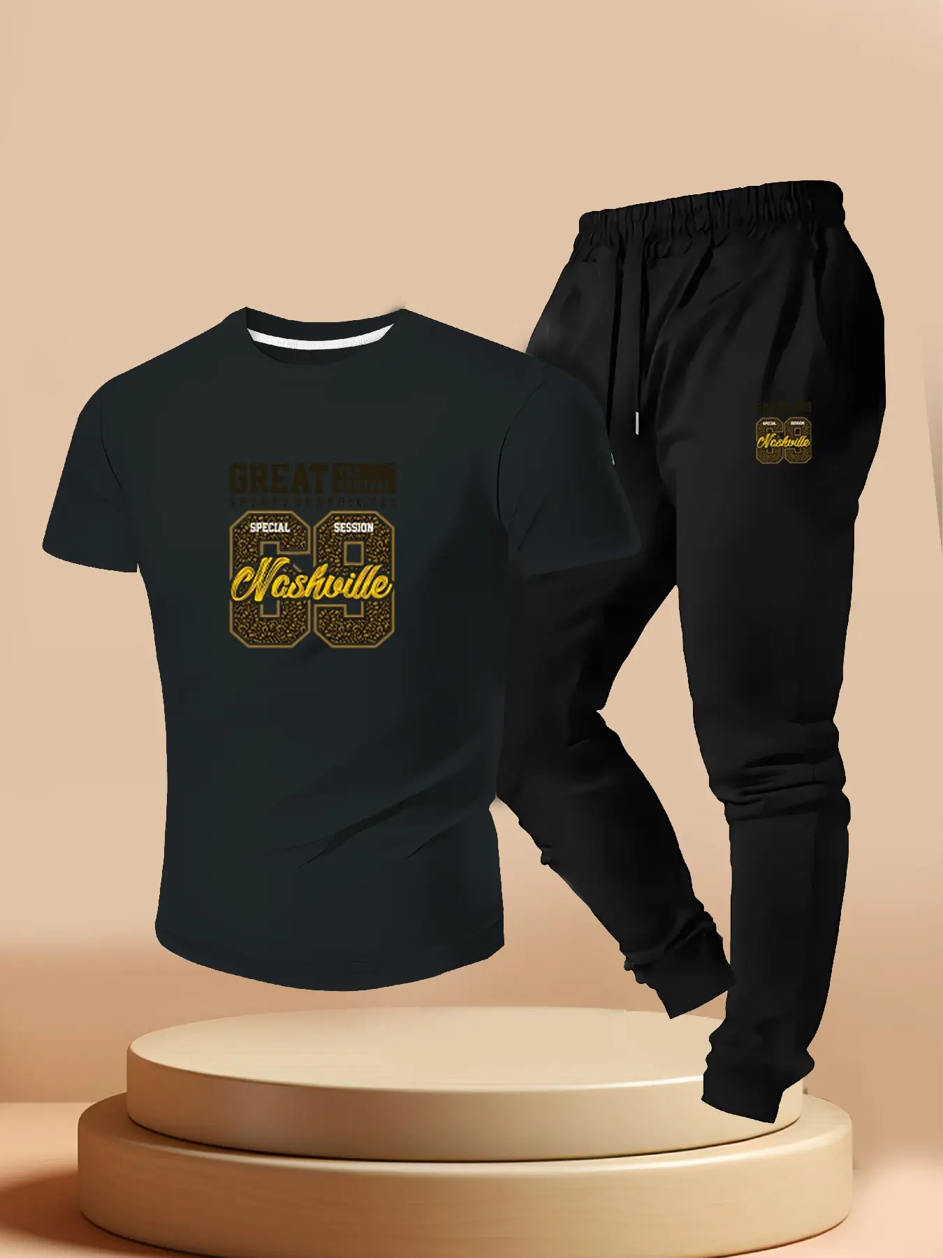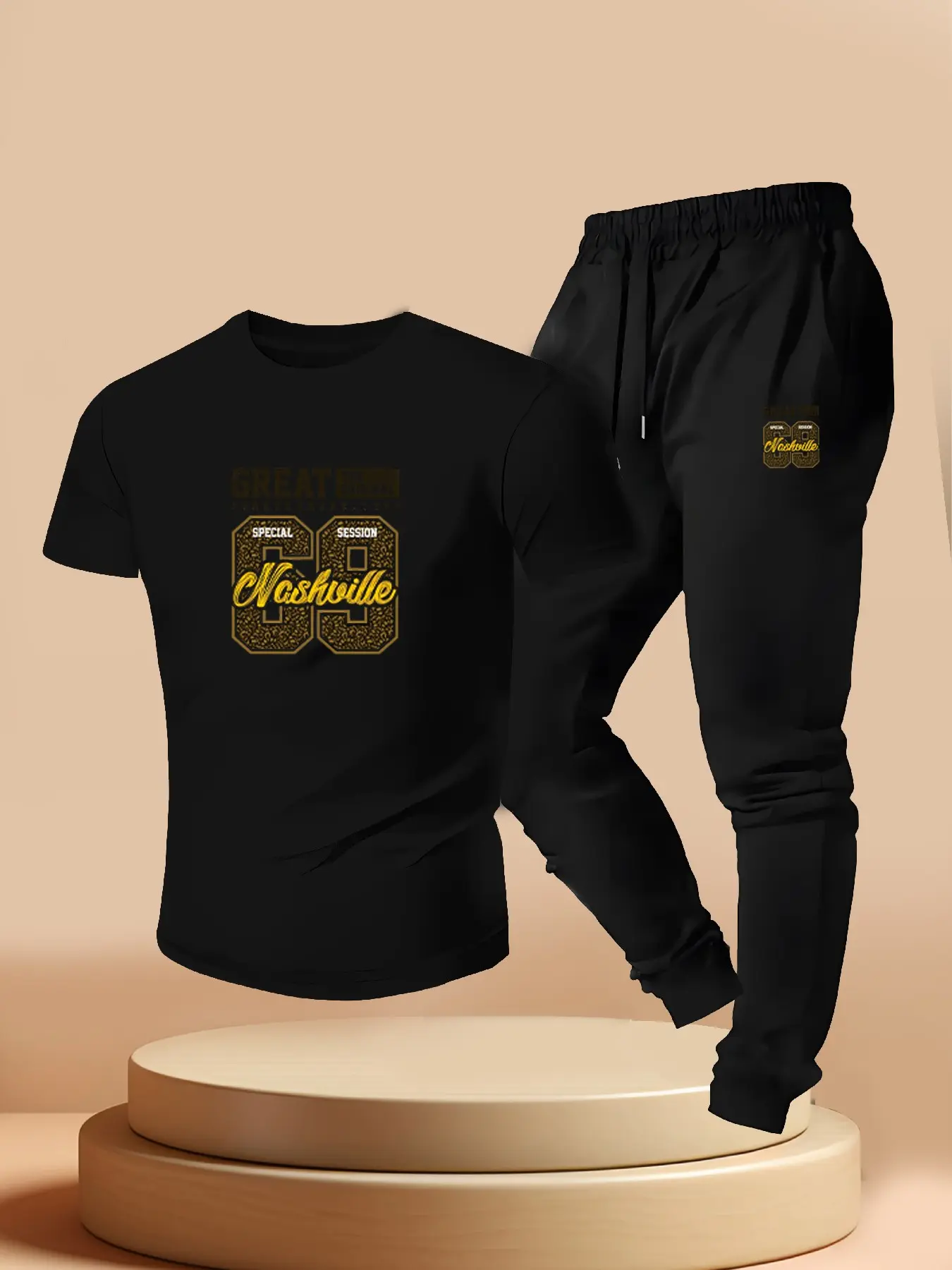 Men's Nashville 69 Print Tee + Sport Pants Set, Casual Short Sleeve T-Shirt, Summer Street Style, Slim Fit, Long Pants