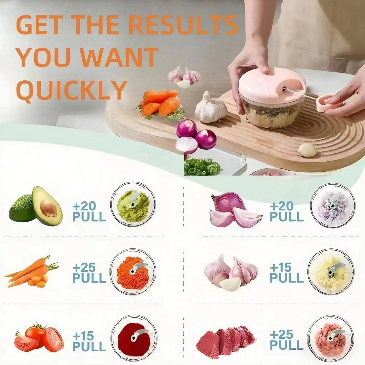 ·Adjustable Cutting Thickness‌: Food chopper easily control the cutting results with 10 pulls for coarse, 15 for medium, and 20+ for fine cuts. Quickly achieve the texture for onions, garlic, and more, bidding farewell to teary eyes and lingering garlic smells on your hands‌