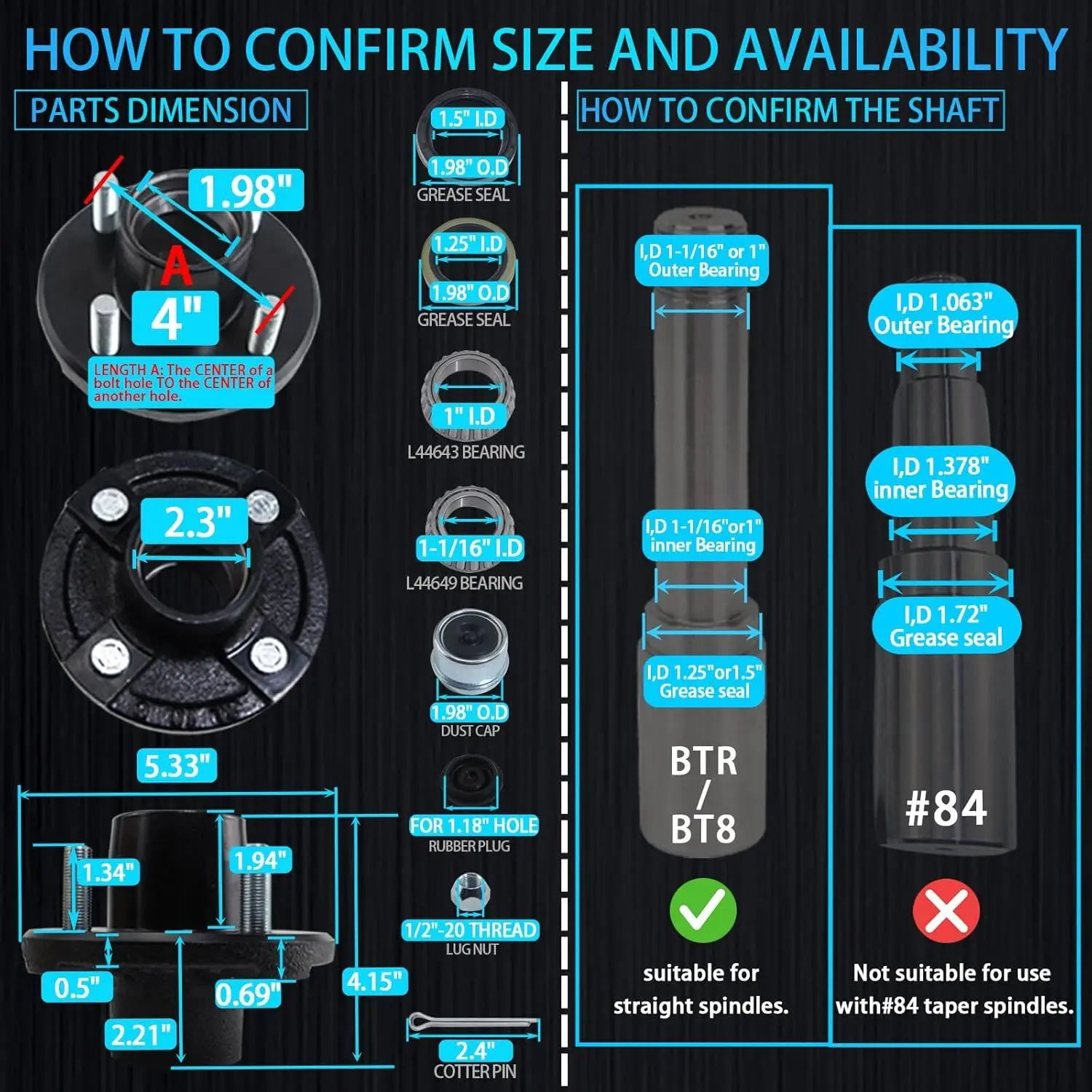 [FIT]For trailer idler hub 4 on 4" for 2,000 lbs trailer axle.Fits both 1" and 1-1/16" diameter straight spindles.With 2pcs 1.25" ID and 2pcs 1.5" ID grease seal.Don't worry about adaptation.