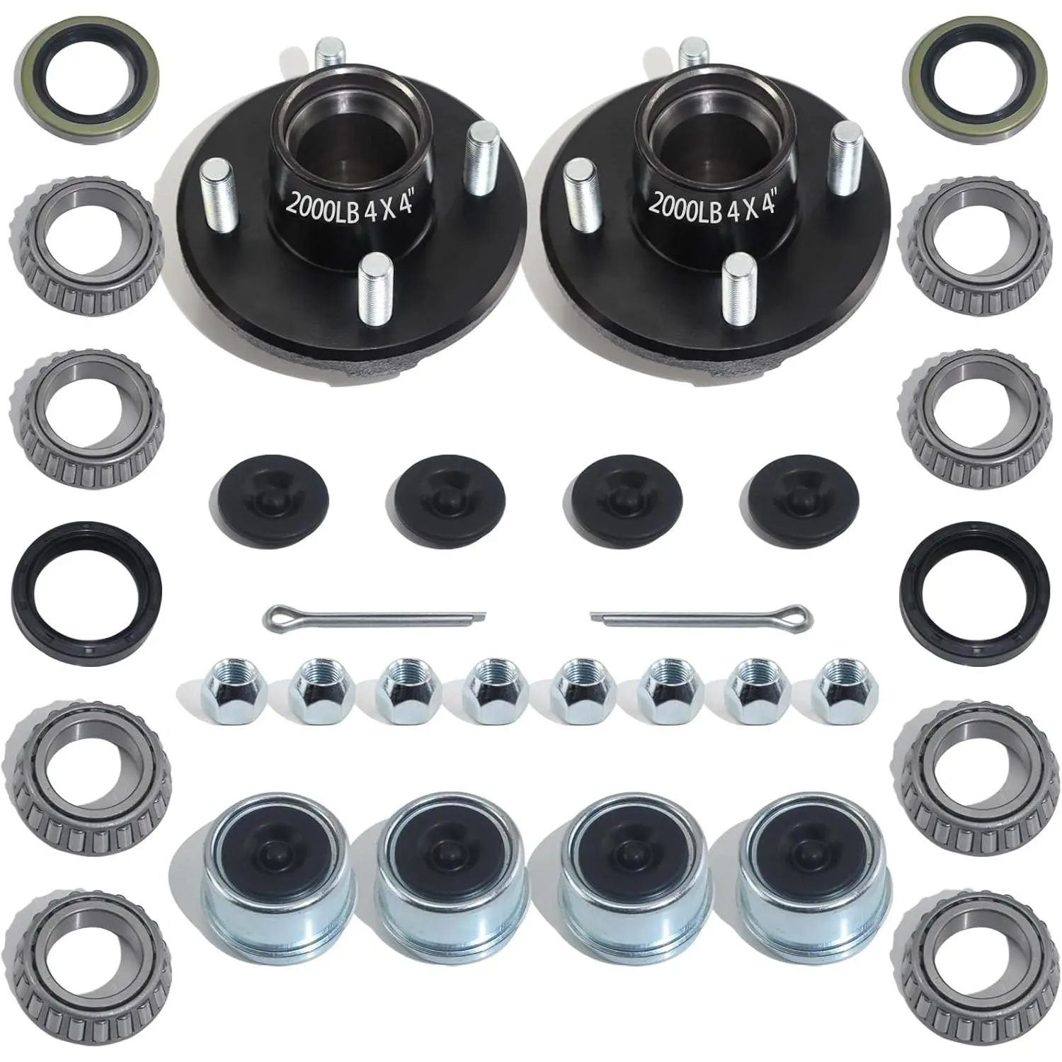 [SIZE & QUANTITY]2PCS Hub(4 bolt 4 for 2000lb), 4PCS L44649 bearings (I.D: 1-1/16''), 4PCS L44643 bearings (I.D: 1.25''), 8PCS Lug nuts (1/2''-20 thread), 2PCS Grease Seal (I.D: 1.25"), 2PCS Grease Seal (I.D: 1.5"), 2PCS Cotter Pins(L: 2.25"), 4PCS Dust cap (O.D: 1.98''), 4PCS Rubber Plug (2.56" O.D - 1.72" I.D.Please check the image.