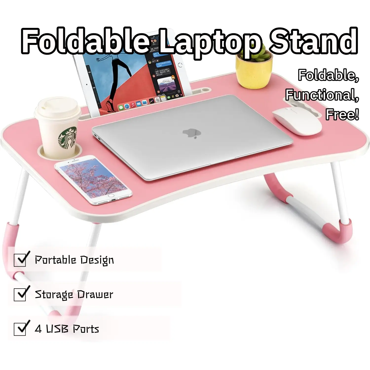 Laptop Bed Desk, Portable Foldable Laptop Table with 4 USB Ports, Storage Drawer & Cup Holder, Multifunctional Lap Desk Tray for Working, Reading & Eating in Bed & Couch