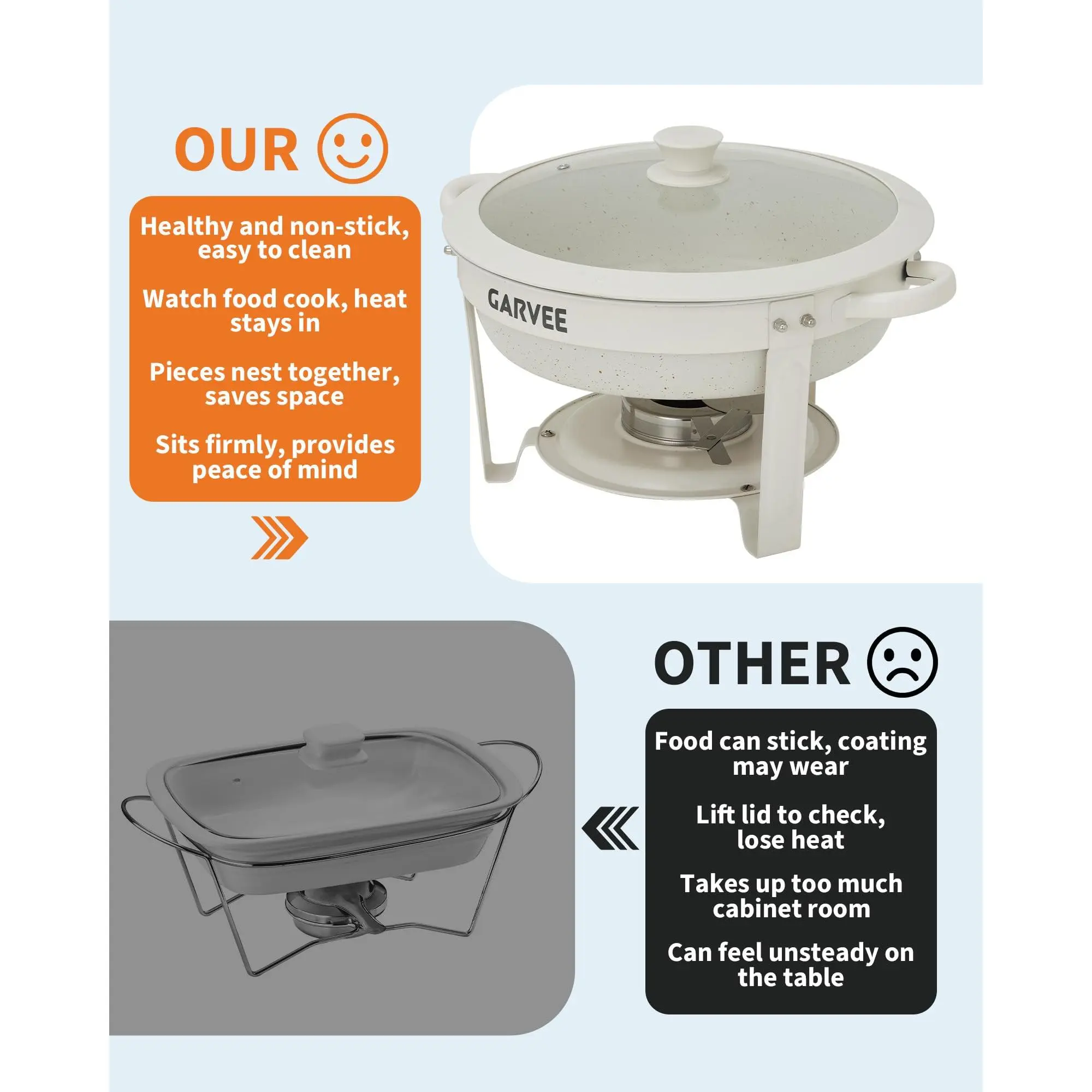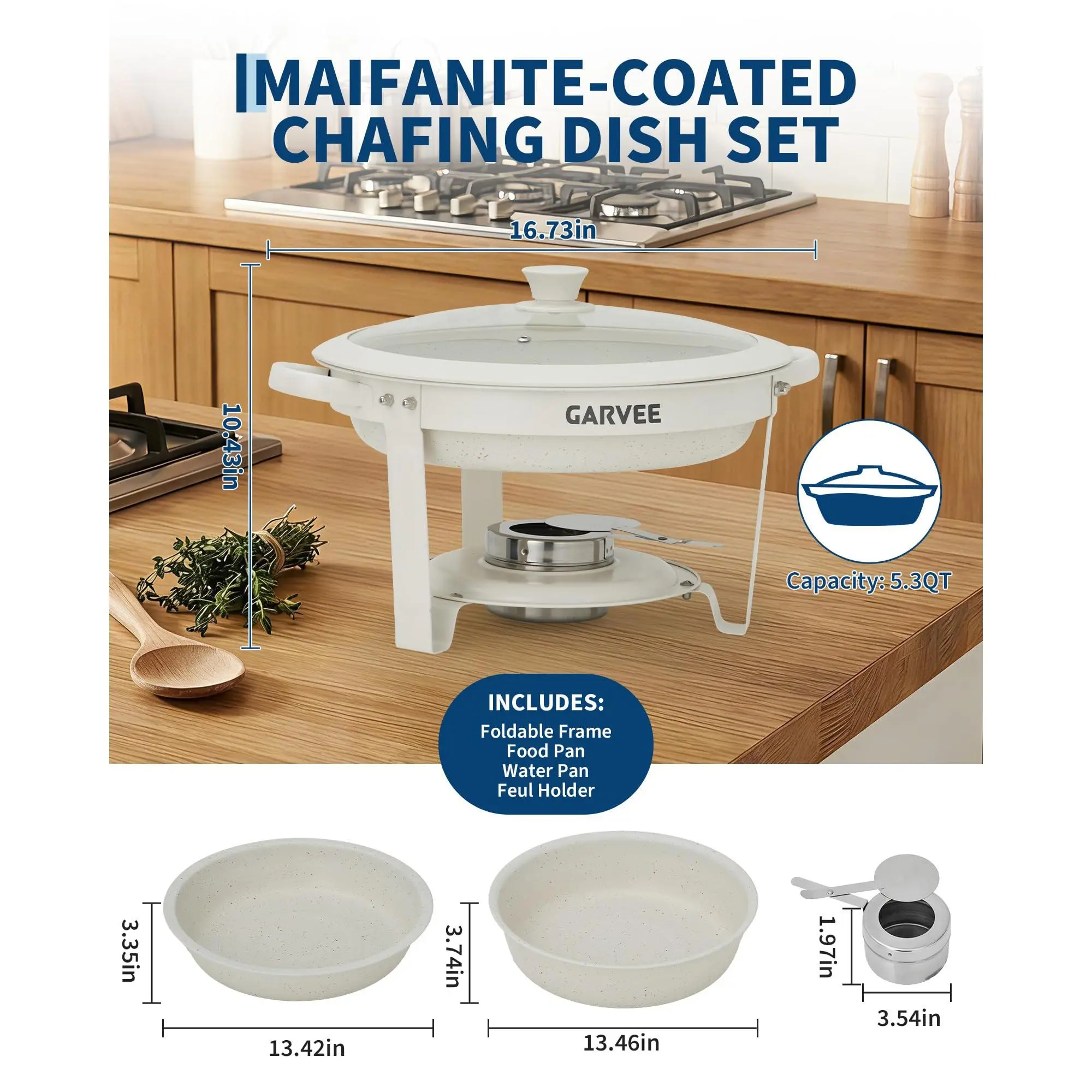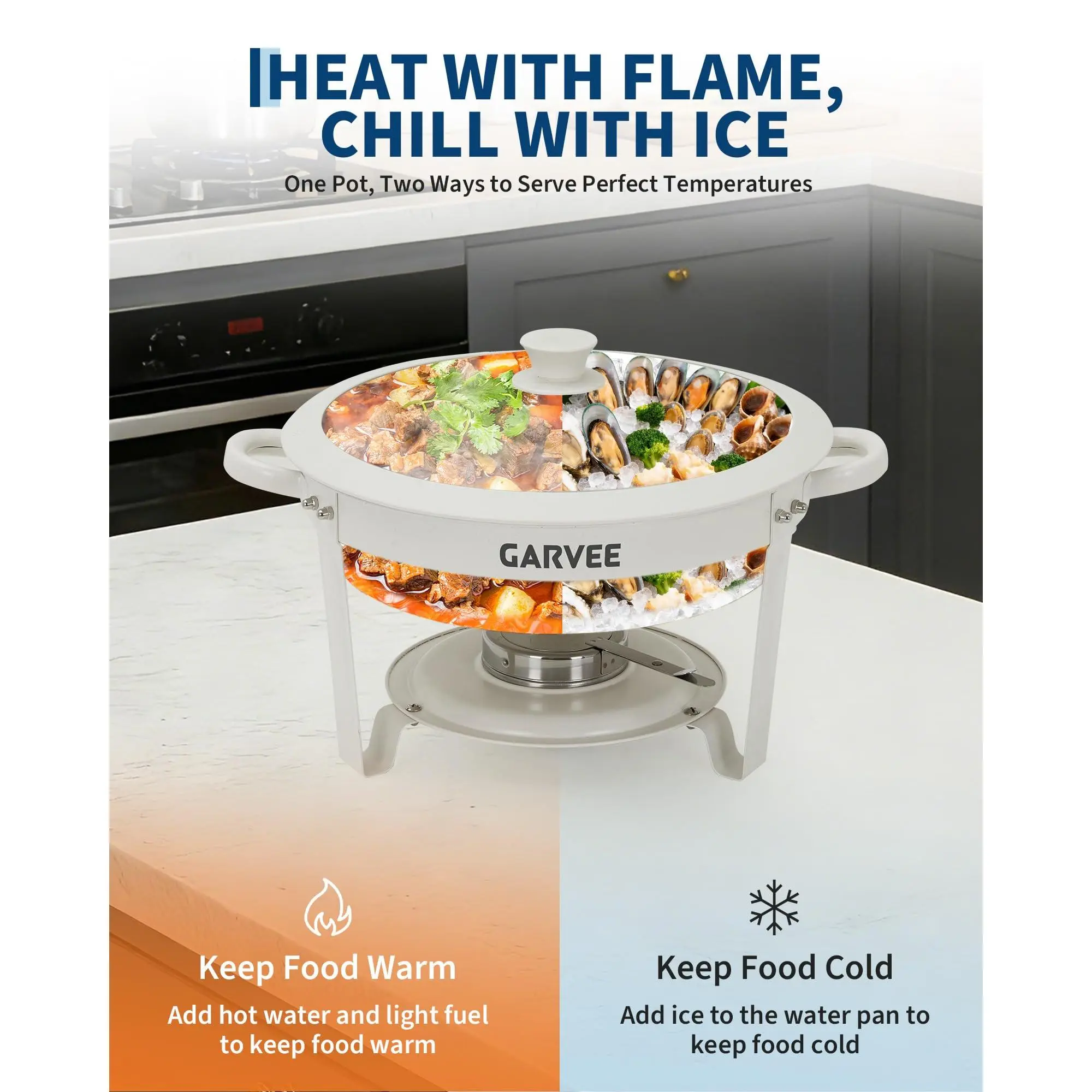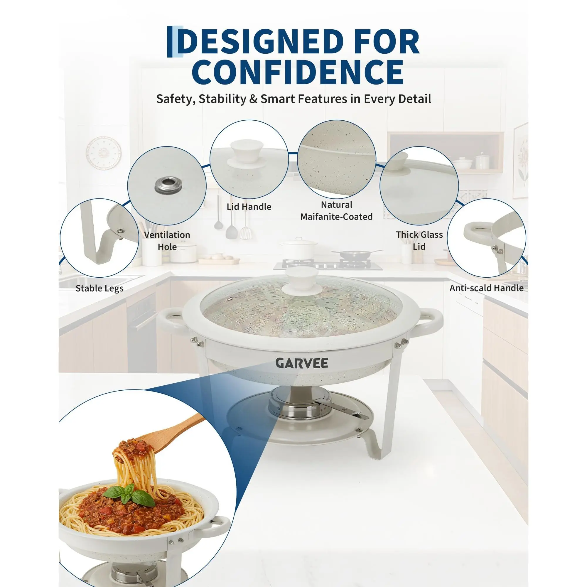Maifanite-Coated Interior: Premium maifanite-coated chafing dishes help deliver reliable heat retention and easy food release while enhancing durability. The smooth white finish adds a modern touch, making this buffet set both practical and elegant for professional or home use