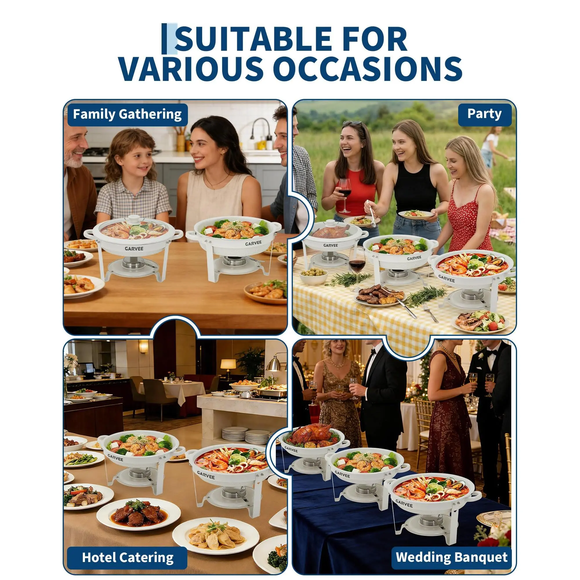 Transparent Lid Design: Each white chafing dish features a transparent lid for quick food viewing without constant opening, helping maintain temperature and freshness. Guests and staff can easily identify dishes, improving service efficiency during busy parties and buffet events