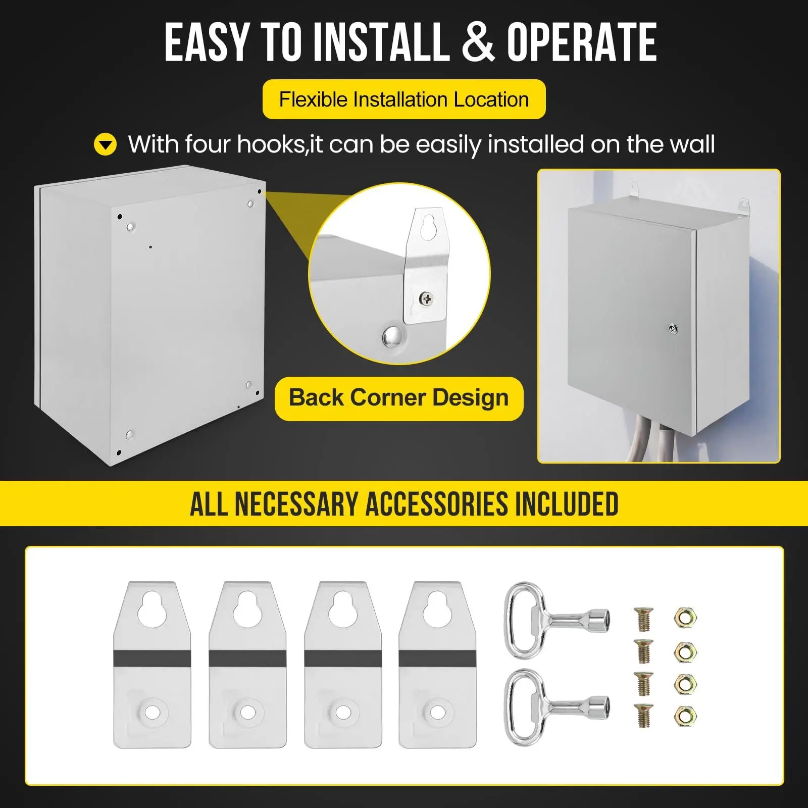 【EASY INSTALLATION】The metal enclosure box comes with a removable galvanized mounting backplate that simplifies the installation of electrical components. Complete with essential accessories and four wall mounting holes at the back, mounting the electrical box securely on the wall is effortless