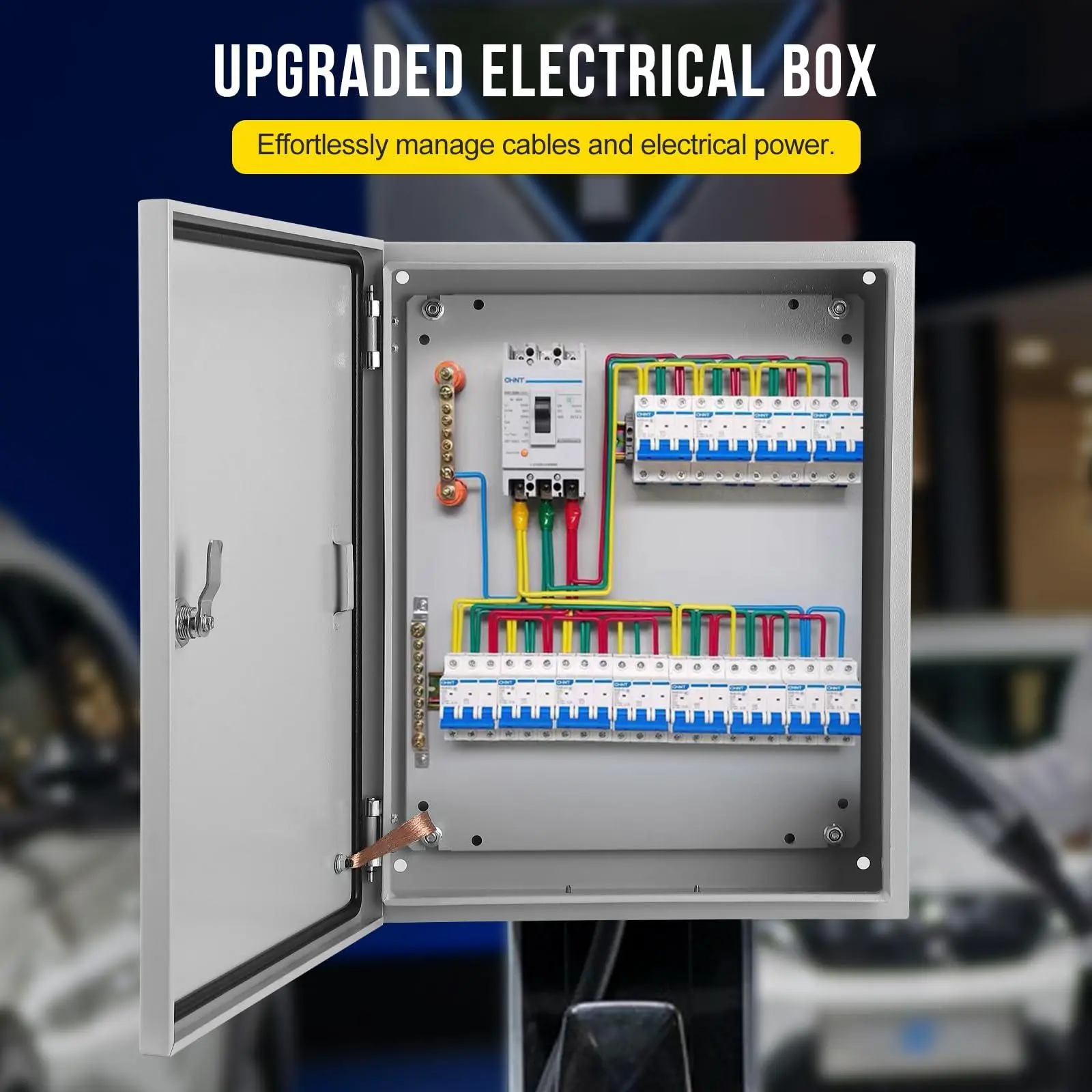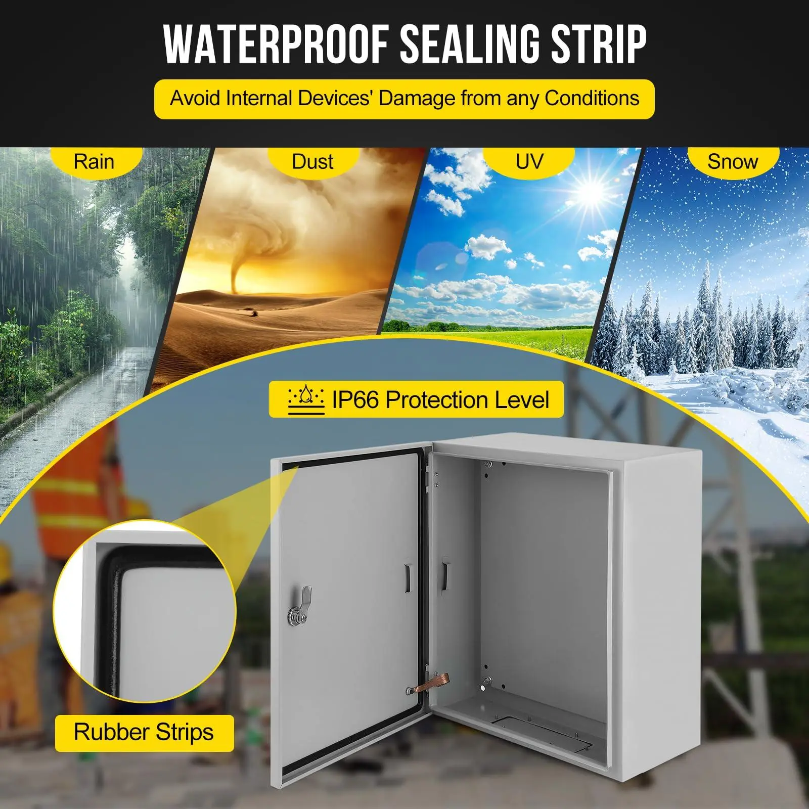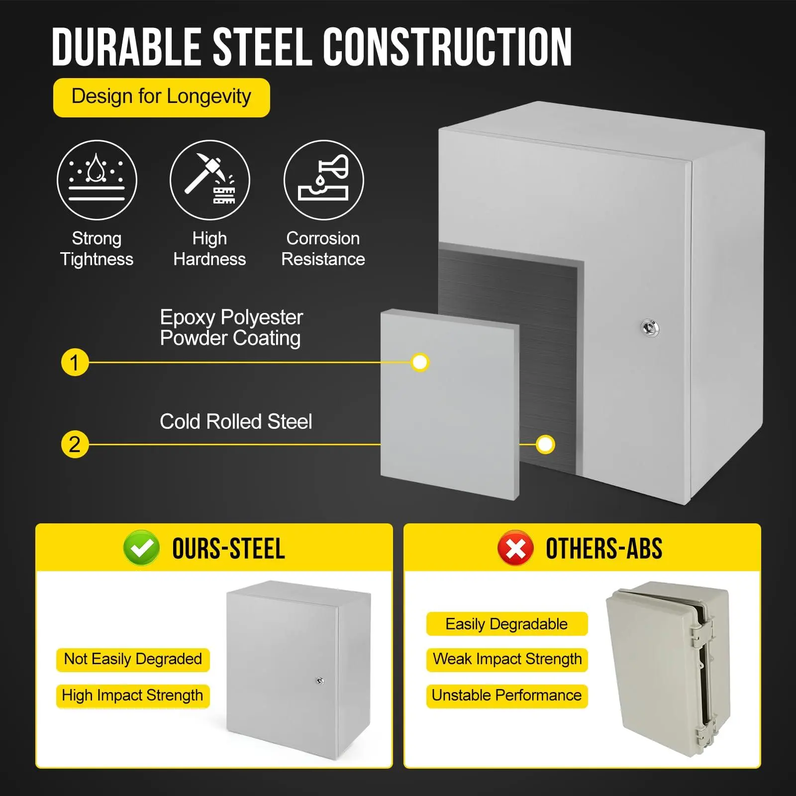 【ROBUST CONSTRUCTION】Crafted from professional carbon steel with precise cutting and welding, the electrical enclosure offers superior wear resistance and protection against rain erosion. The epoxy polyester powder coating enhances mechanical properties and provides excellent leveling properties