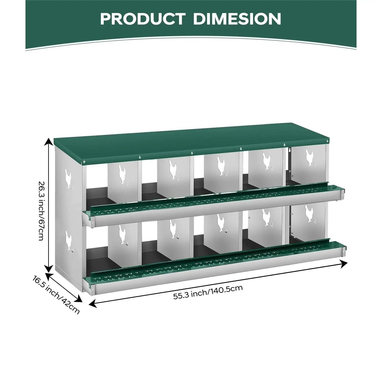 10-Compartment Chicken Nesting Box, 2-Tier Galvanized Steel Egg Laying Box with Large Vented Holes, Wall-Mountable Design, Easy Egg Collection & Cleaning for Chickens - Green