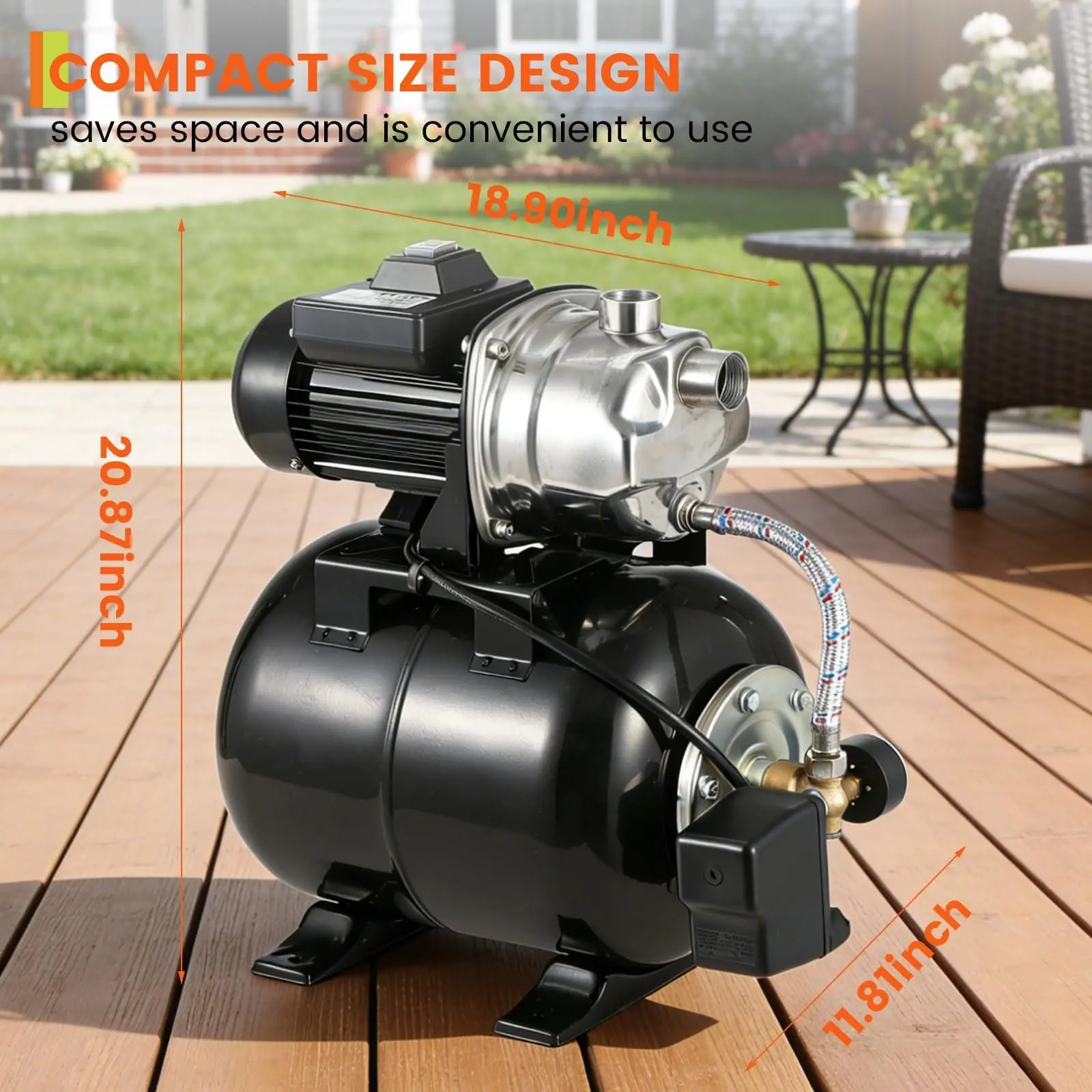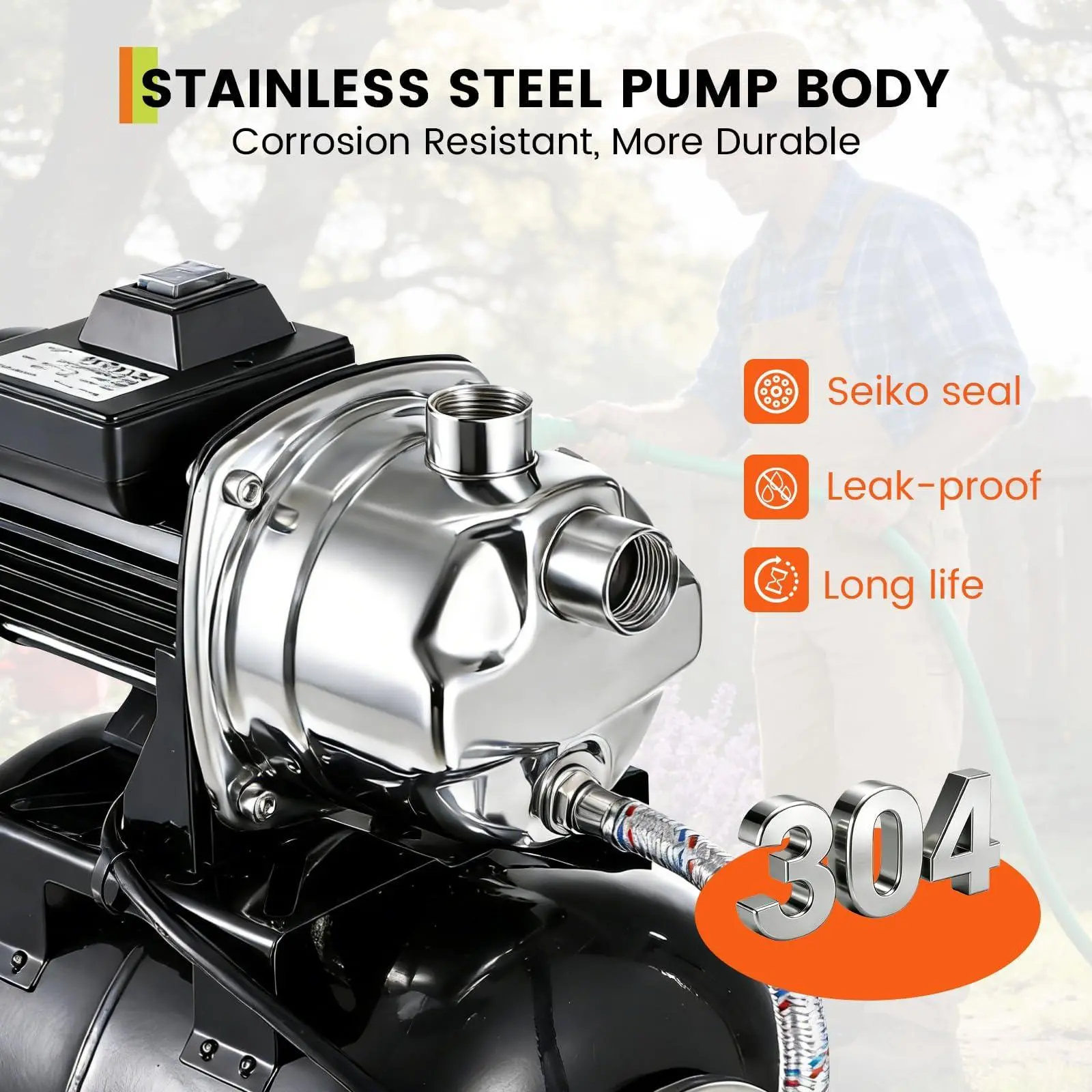 Durable Build with Complete Pressure Tank System: Constructed with a corrosion-resistant stainless steel pump body and includes a 5-gallon anti-rust steel pressure tank. The automatic pressure switch (cuts in at 19 PSI, cuts out at 38 PSI) ensures steady water flow, while the integrated pressure gauge allows for easy real-time monitoring.