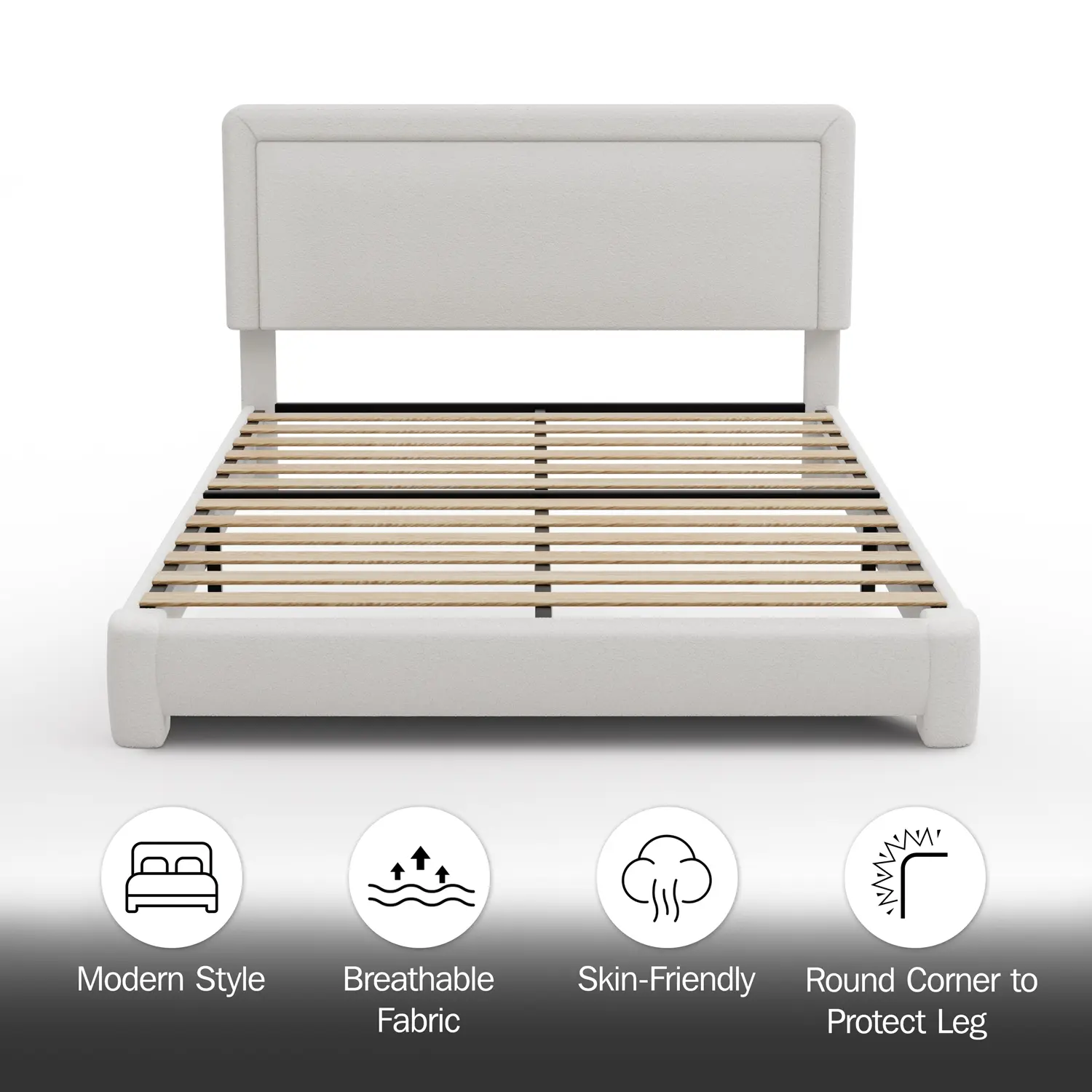 Upholstered in soft boucle teddy fabric, this bed frame offers a cozy sleeping experience. The adjustable headboard allows for personalized comfort. Gentle rounded corners ensure safety, making it ideal for any bedroom. No box spring is required, simplifying setup.