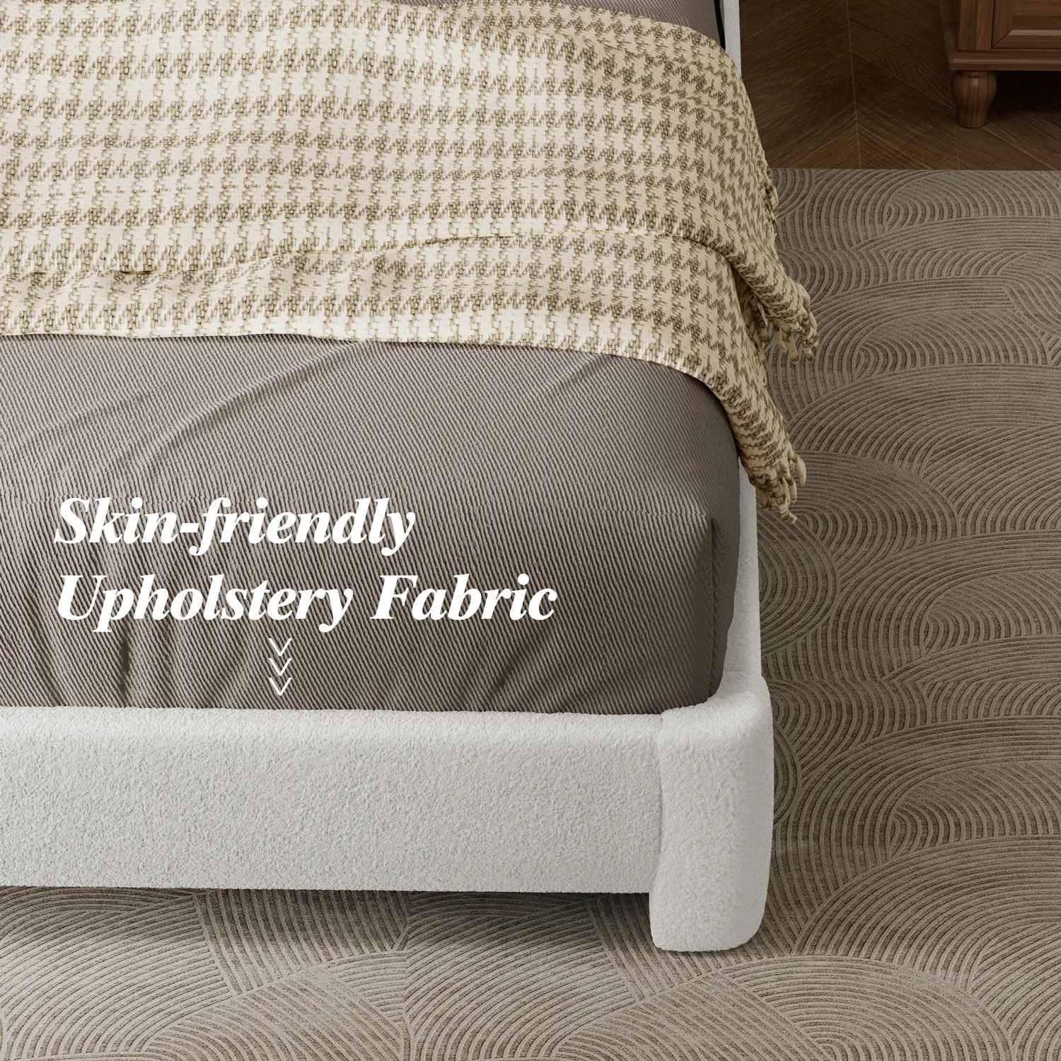 Upholstered in soft boucle teddy fabric, this bed frame features an adjustable headboard, gentle rounded corners for safety, and requires no box spring. Easy to assemble, combining comfort and practicality for any bedroom