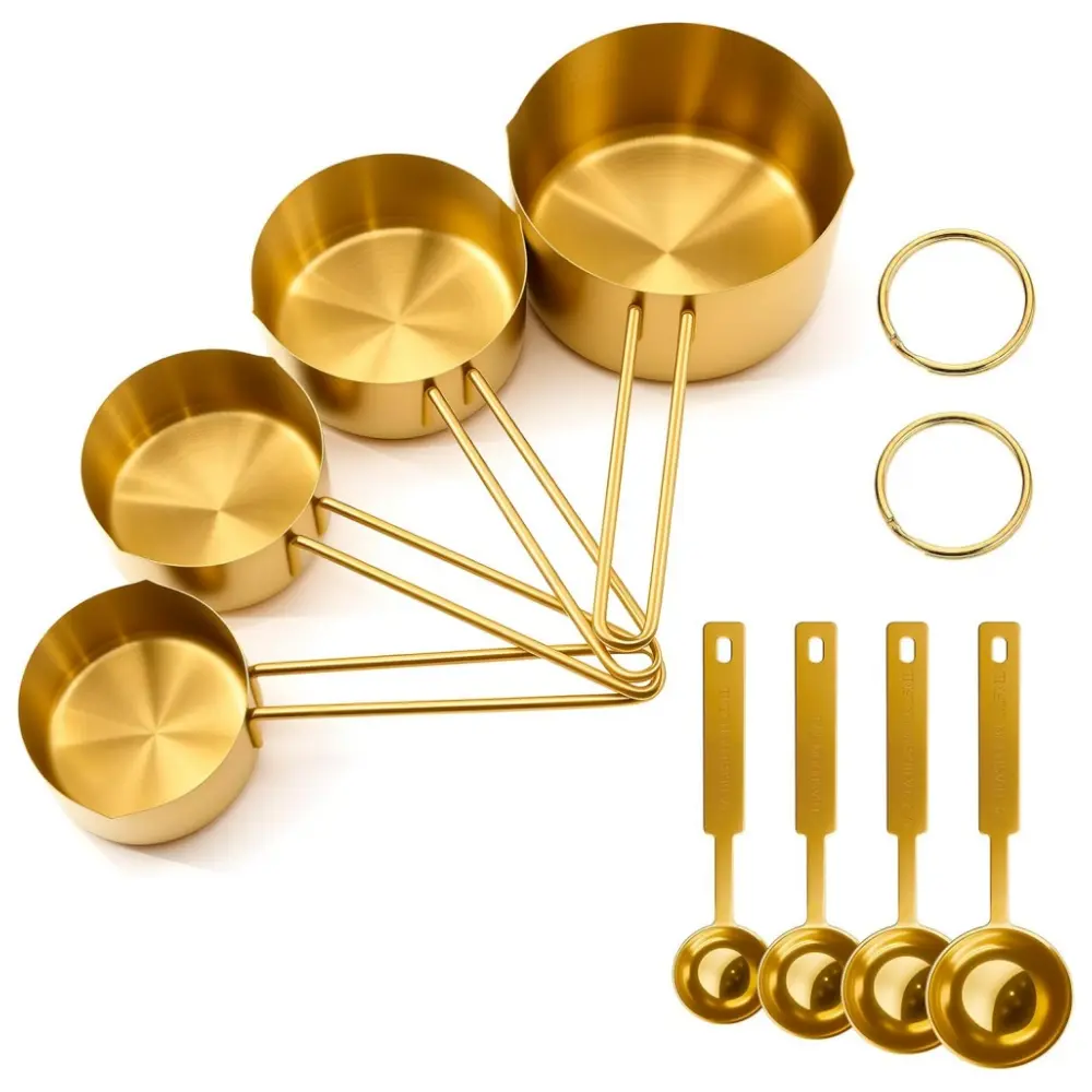 Smooth edges and dainty design:This gold metal measuring cups and spoons set is beautifully designed with a simple and dainty look. The measuring cups have smooth edges, the spoons are compact and space-saving, and the handles are extended for easy handling. The exquisite glossy finish makes it not only a practical tool but also a stylish accent in the kitchen, making it a perfect gift for baked goods enthusiasts.