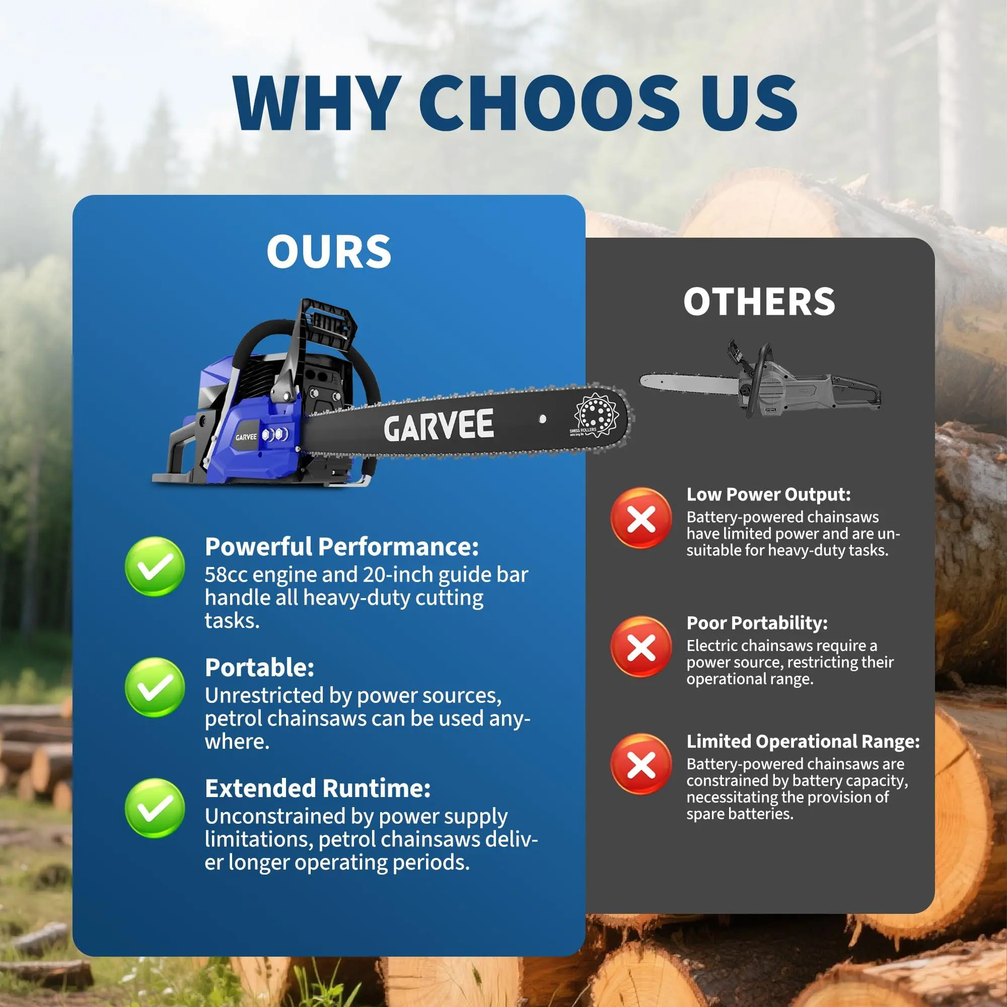 【58CC Two-Stroke Power for Efficient Cutting】This gas powered chainsaw features a 58CC two-stroke engine delivering 3.4 horsepower and a maximum speed of 10000 RPM, effortlessly handling heavy-duty tasks. Equipped with a 20-inch guide bar, it efficiently    cuts logs, thick branches, and firewood up to 20 inches in diameter, providing a powerful yet smooth cutting experience that excels in processing all types of wood.