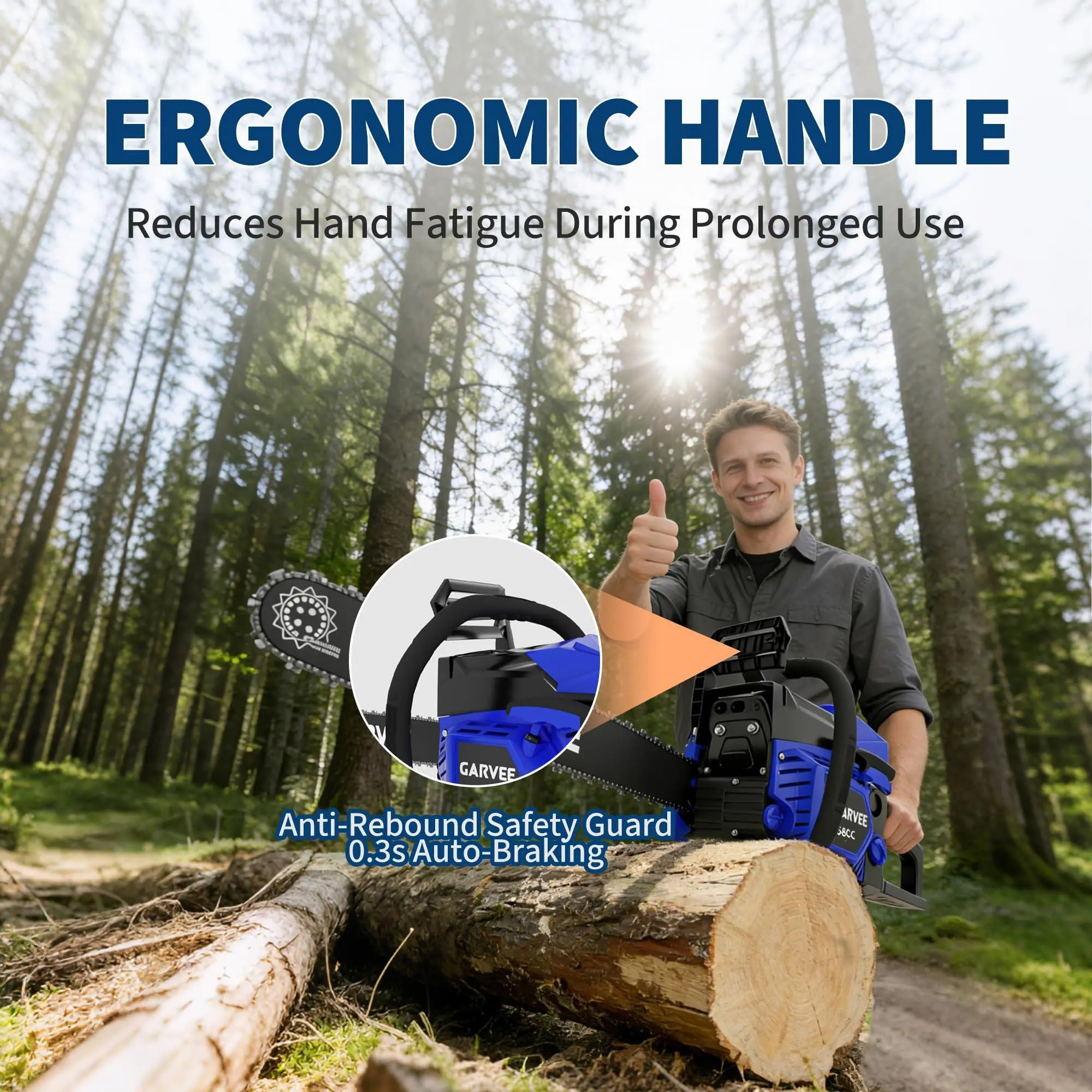 【Enhanced Comfort】The 20-inch chainsaw features a built-in anti-vibration system that significantly reduces arm fatigue during extended use. Paired with an ergonomic, non-slip handle, it improves control precision and grip comfort, helping you efficiently    complete various projects while minimizing fatigue during prolonged operation.