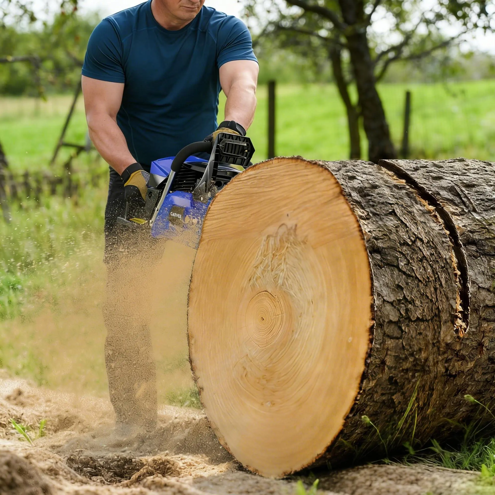 【Convenient Operation Quick Start】The gas chainsaw features an optimized dual-mode cold/hot start system with an extended starter cord, enabling ignition within 3 seconds to tackle any weather challenge. The side-mounted chain tensioner allows tool-free    adjustment, ensuring optimal cutting performance at all times for effortless operation.