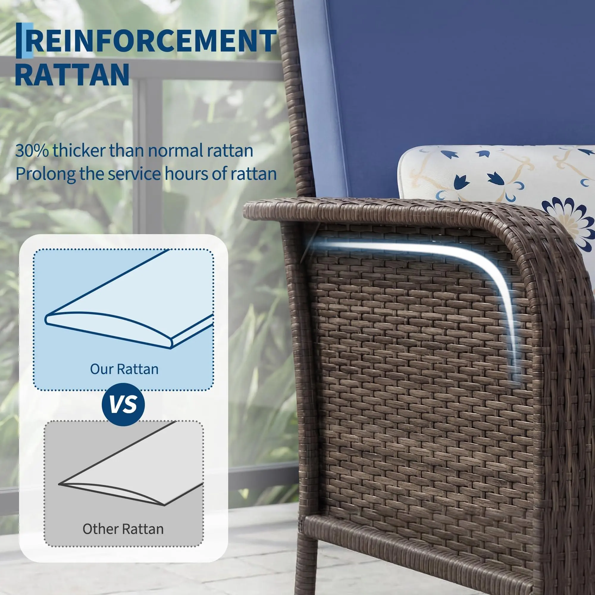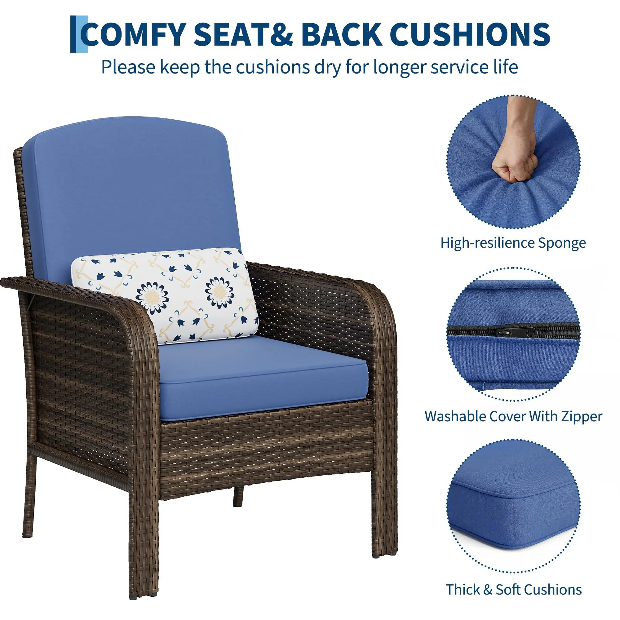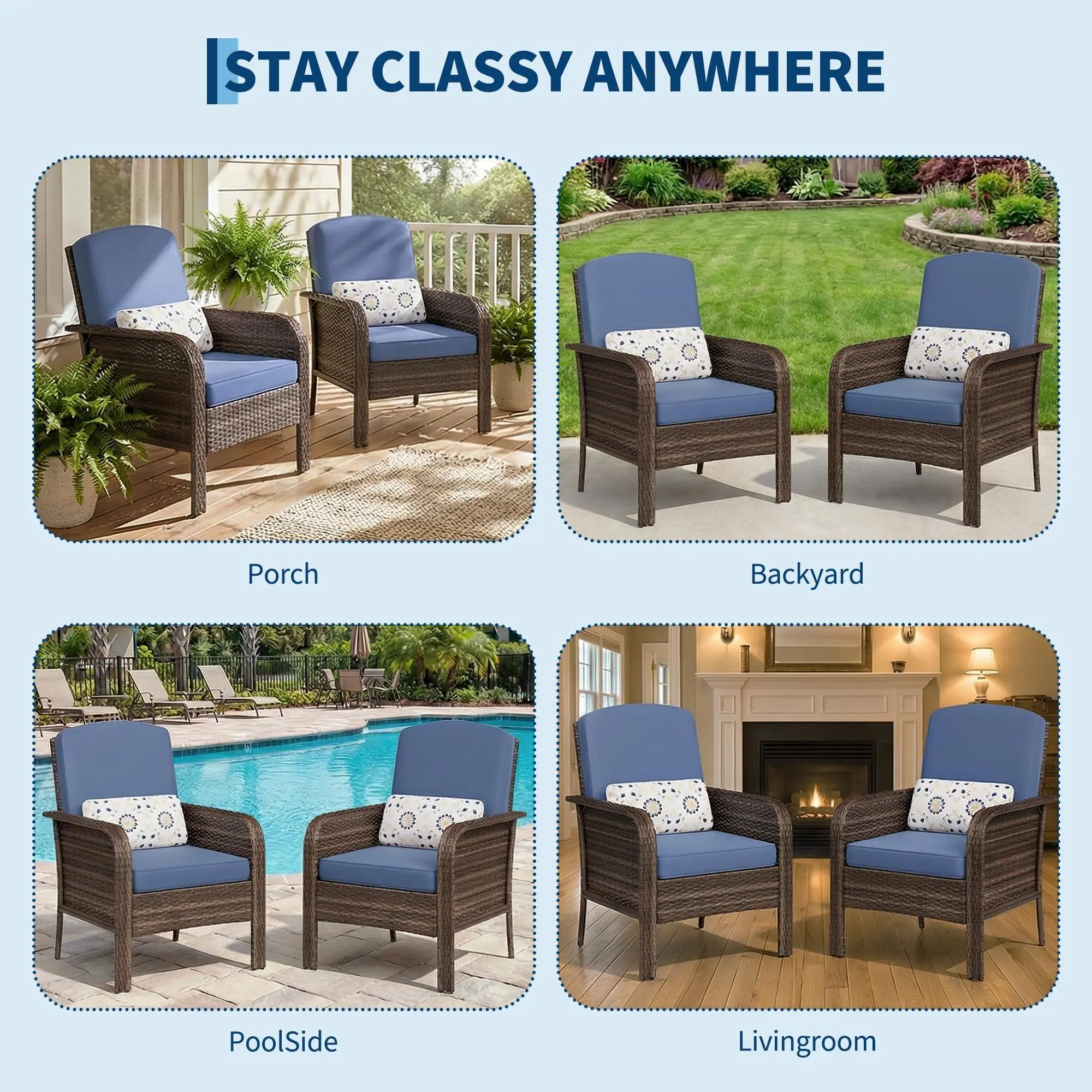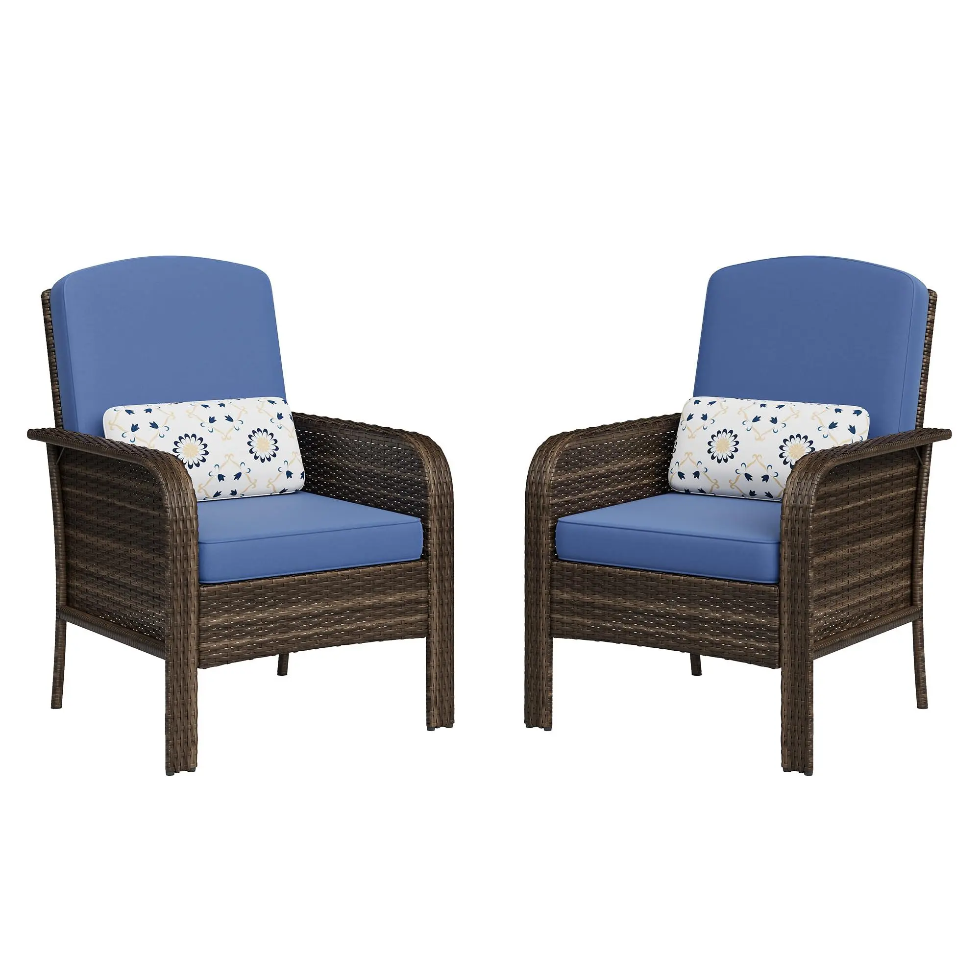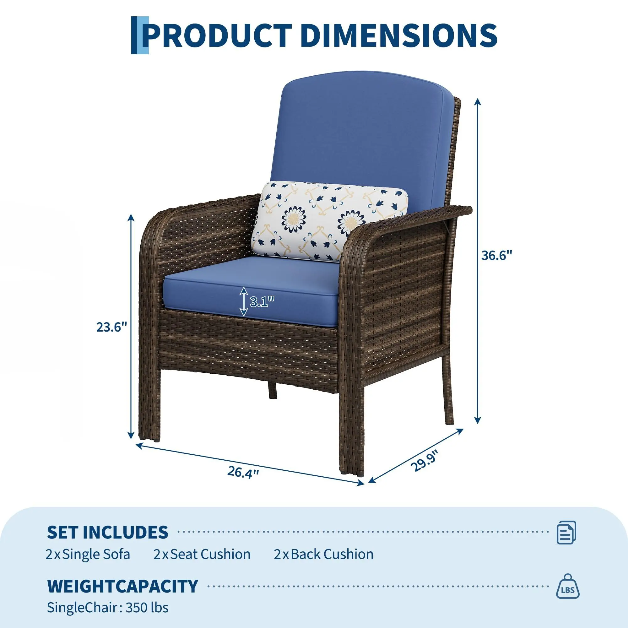 5. 2-Piece Outdoor Patio Set, All-Weather Wicker Chairs with High Back & Cushions for Deck, Porch, Garden, Brown Rattan with Blue Cushion