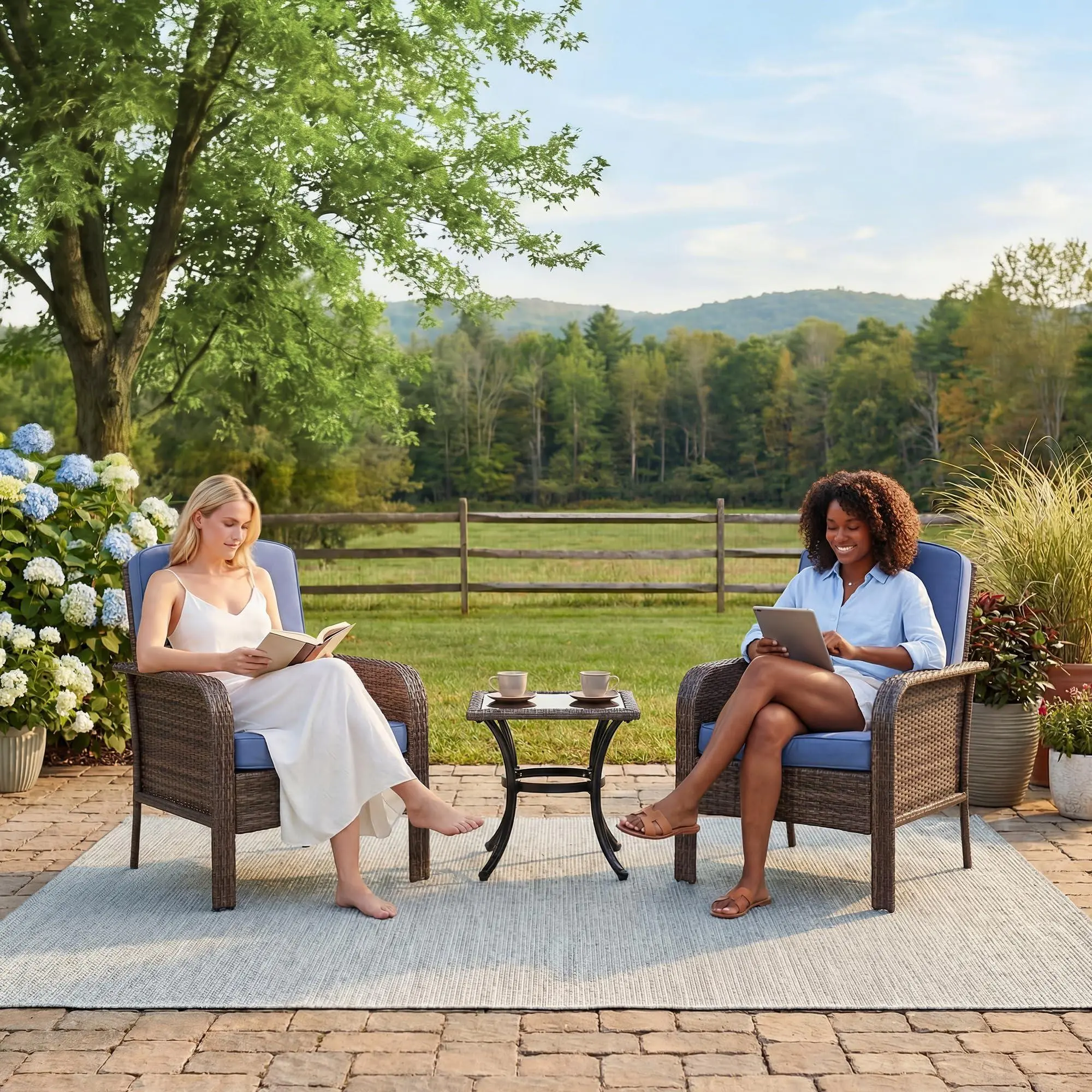 Plush, Comfy Cushions Included: Each chair comes with soft, thick cushions (removable and easy to clean) for added comfort, making your outdoor lounging experience even more enjoyable.