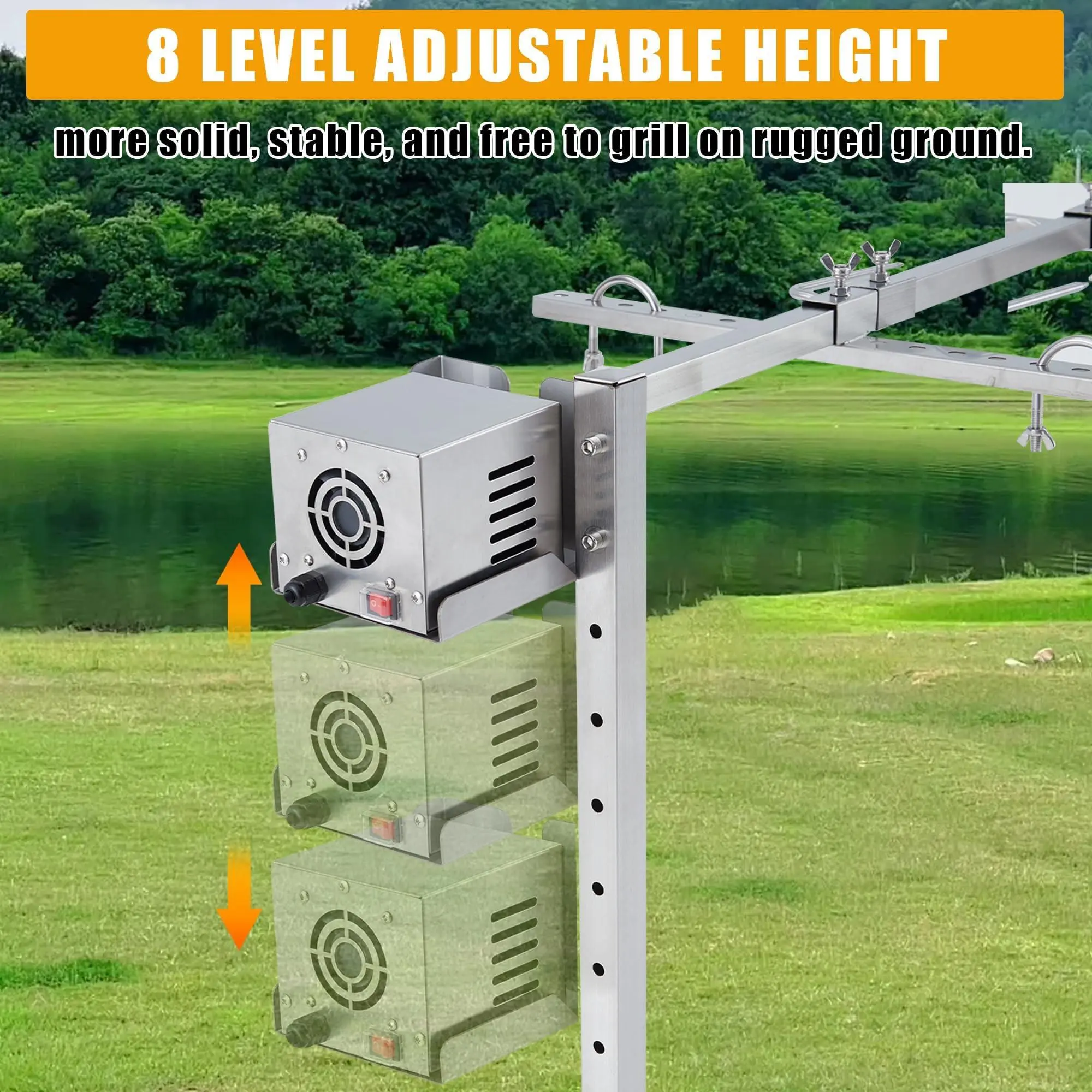 Adjustable Heights - Designed with 8 different height holes, ranges from 18.3" to 33.5", enabling precise temperature control for any meat size.
