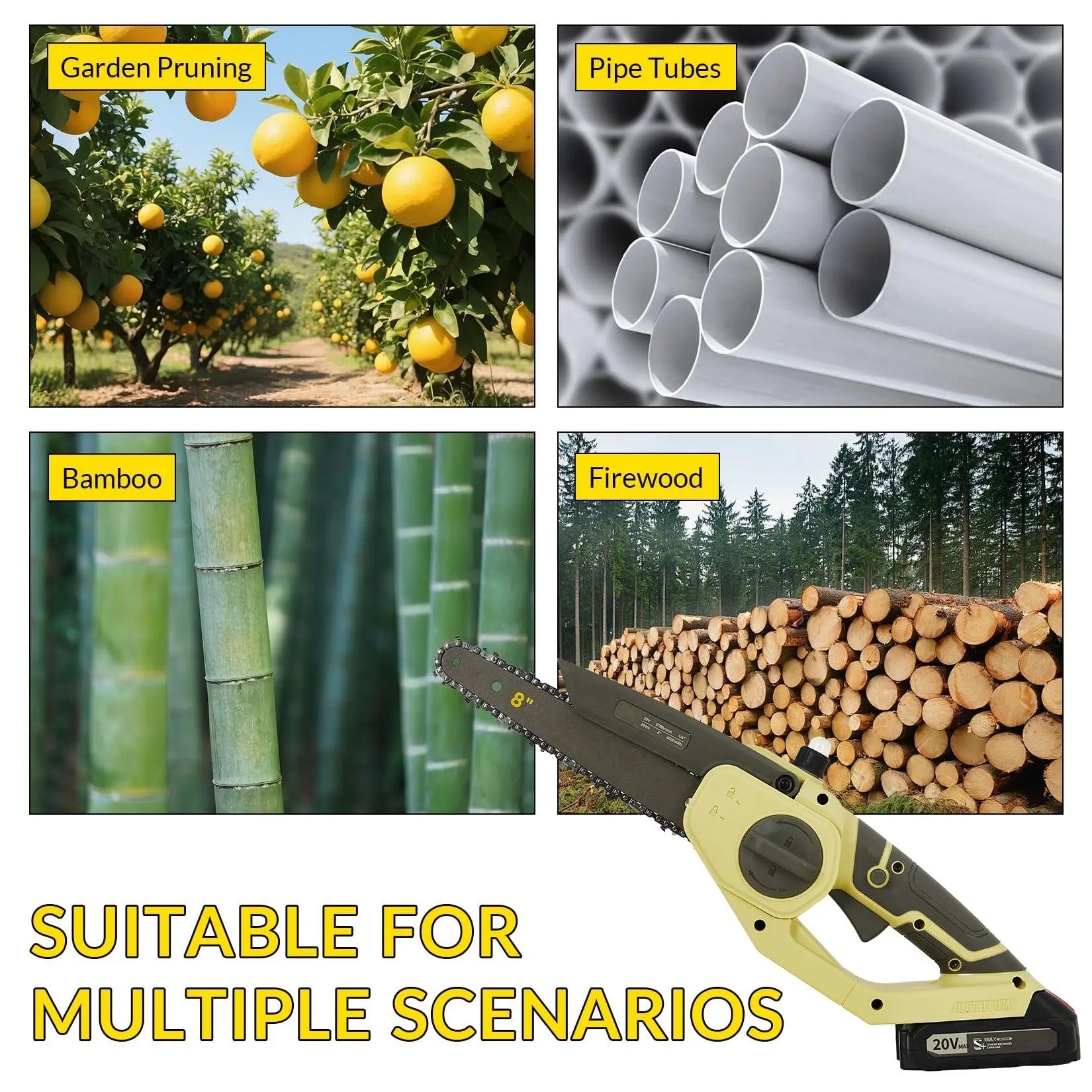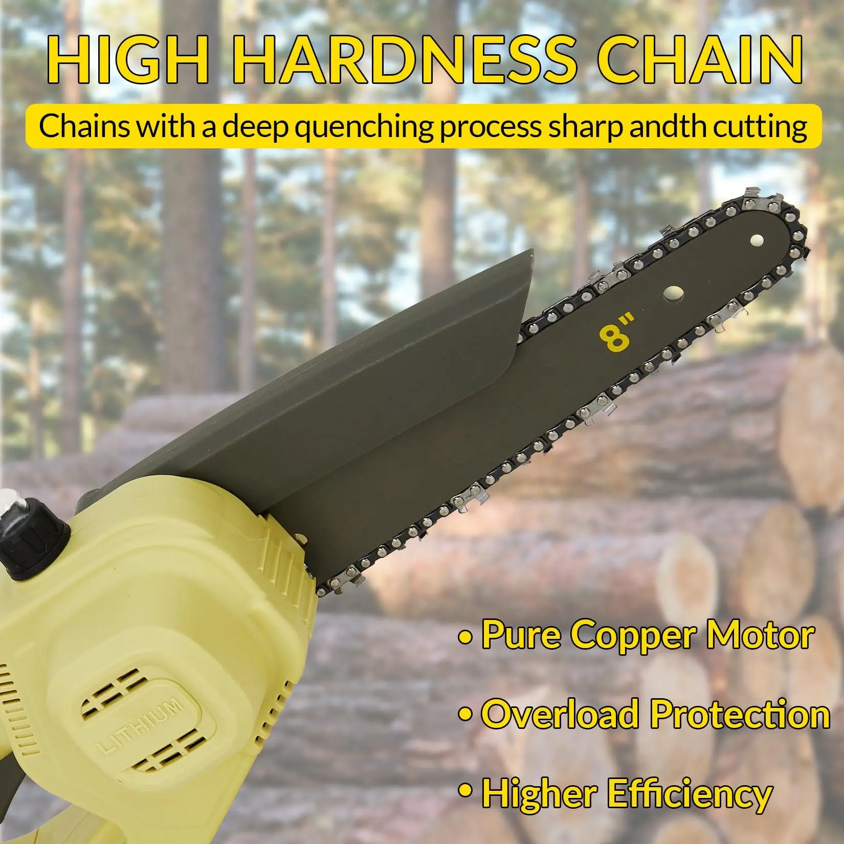 [Automatic Oiling System]-- The mini chainsaw cordless featuring a pure copper oil pump, this product automatically lubricates the chain during use. This ensures smooth cutting operations and significantly reduces wear and tear on the chain, prolonging its lifespan