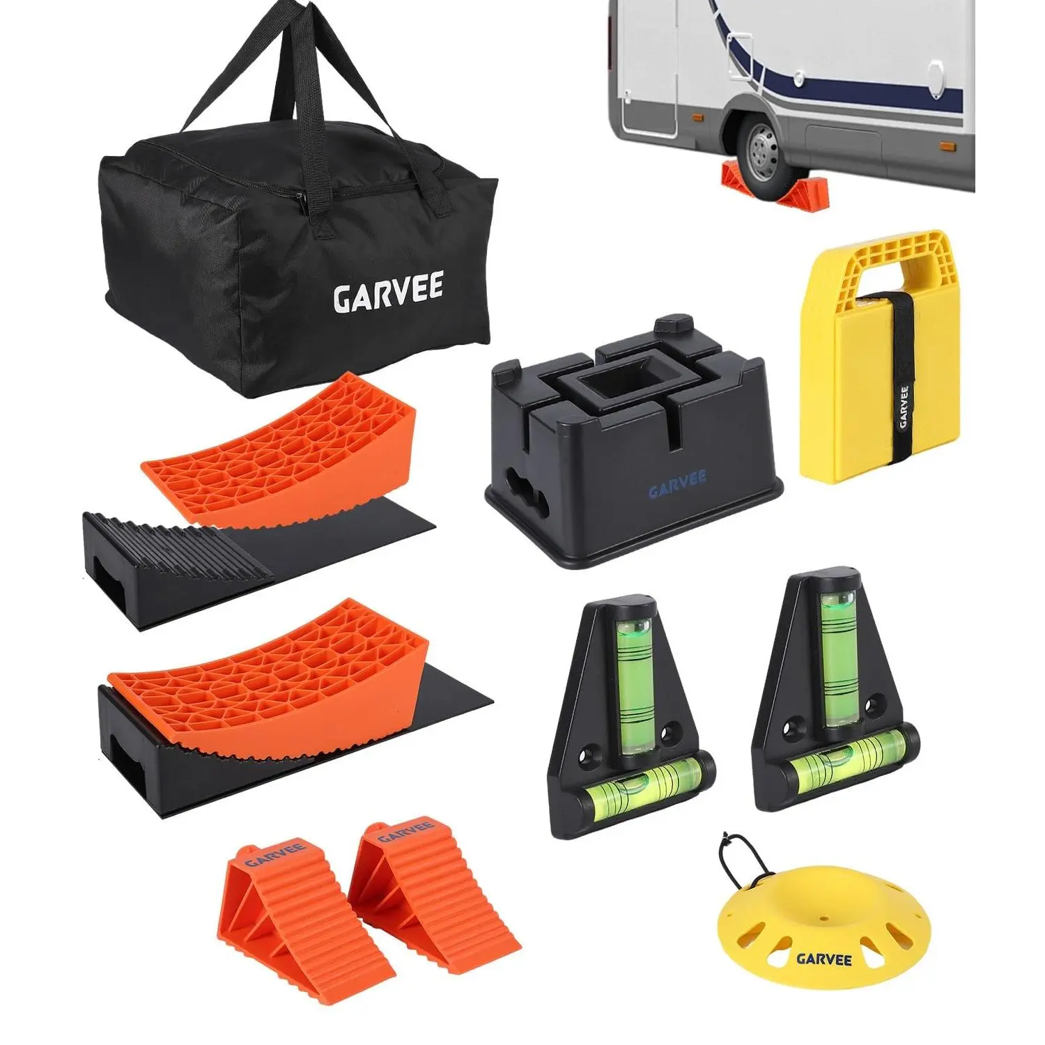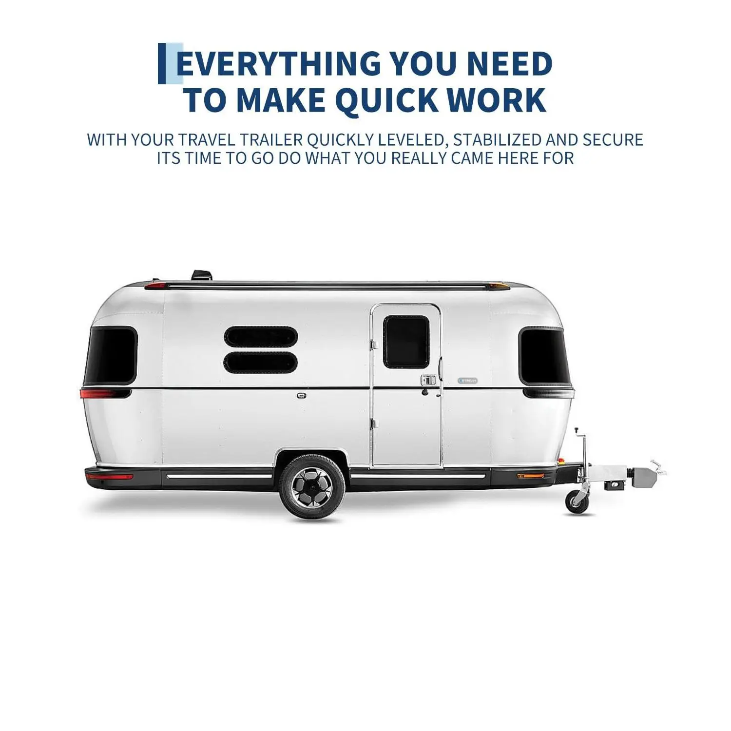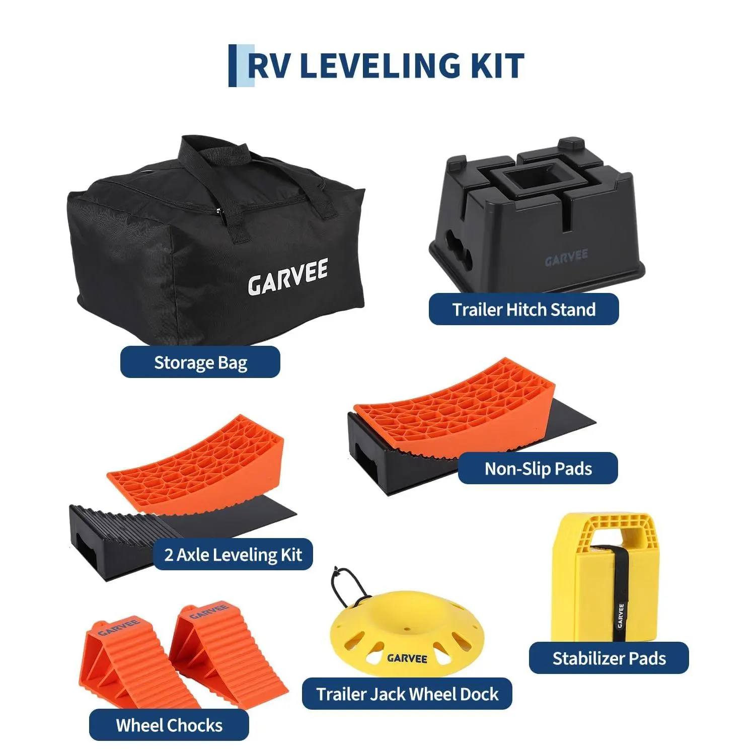 COMPLETE 12-PIECE RV LEVELING SET: This RV leveling kit provides everything needed for stable, safe, level parking with your travel trailer, camper, or RV. The package includes 2 x Axle Leveling Kits, 2 x Wheel Chocks, 1 x Trailer Hitch Stand, 4 x Stabilizer Pads, 1 x Jack Chocks, 2 x Precision Levels and 1 x Storage Bags—no extra tools needed, saving you time on separate purchases.