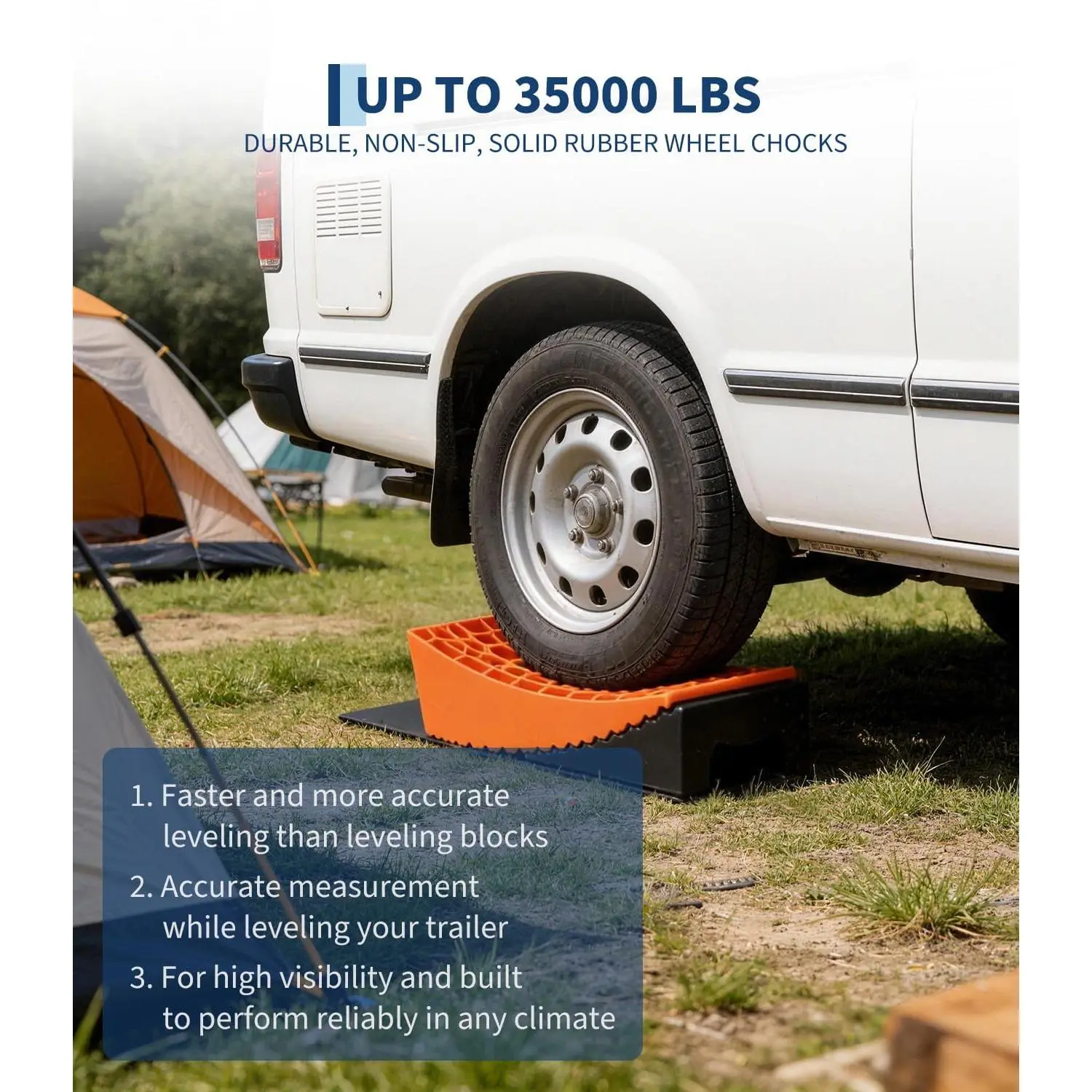 RELIABLE&SAFETY PROTECTION The 2 wheel chocks prevent your RV from rolling or sliding during parking, loading, or unloading—simply place them on both sides of the tires. The 1 jack chock works with your RV jack to add safety when lifting for maintenance or tire changes, with an anti-slip design to prevent jack failure.